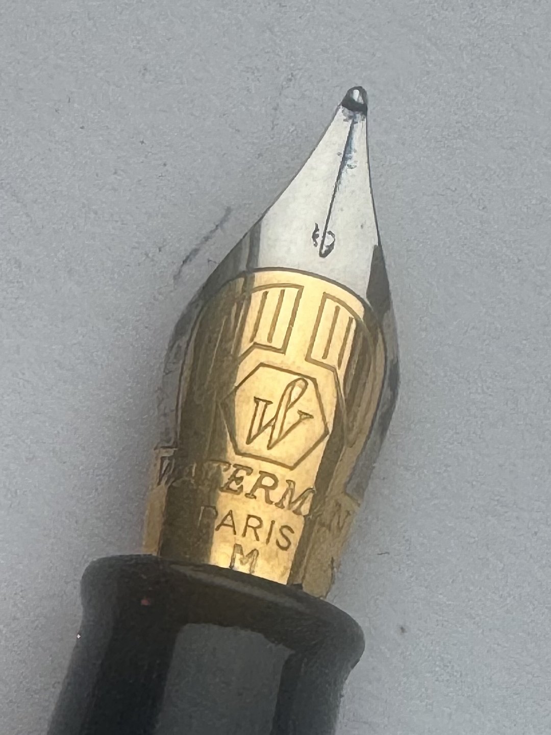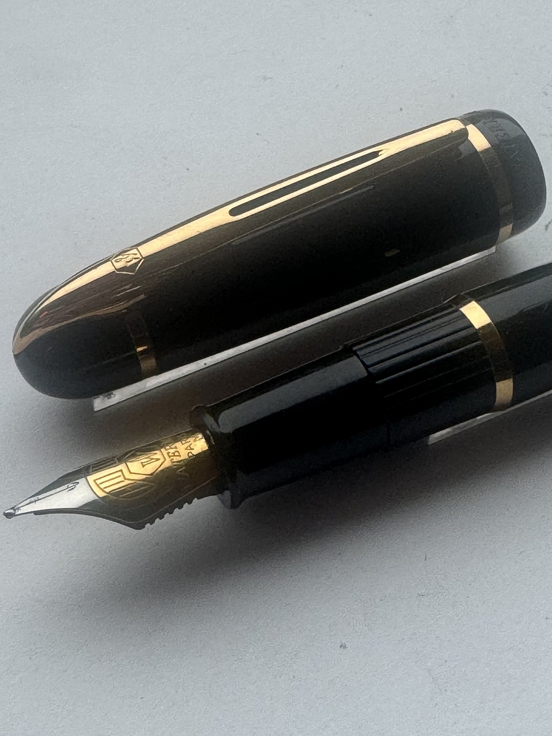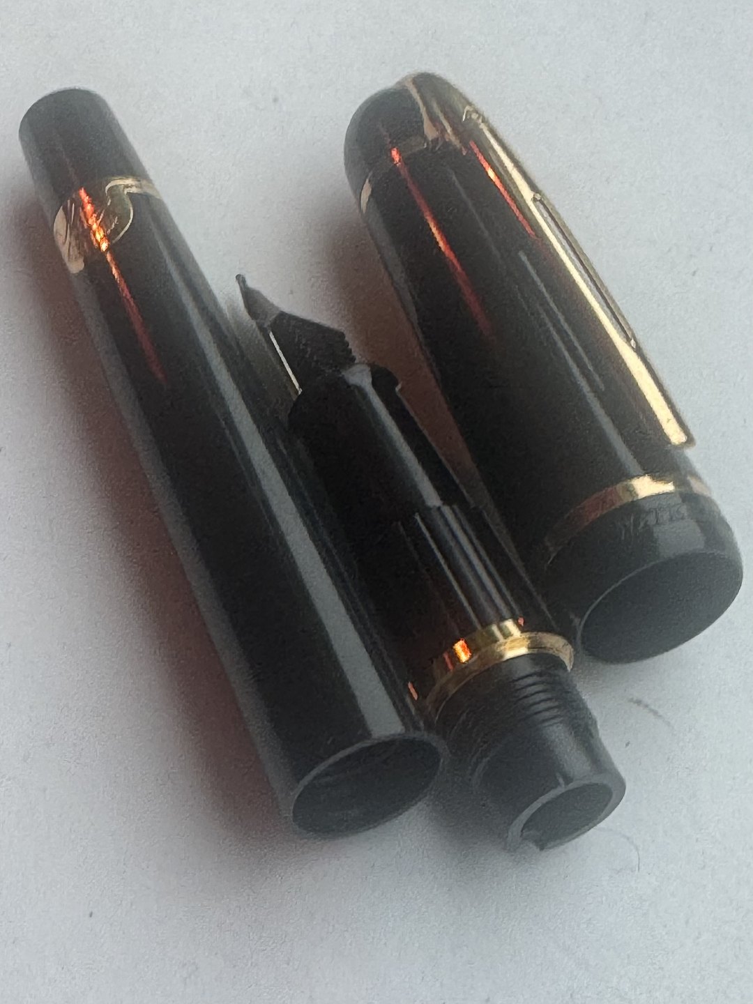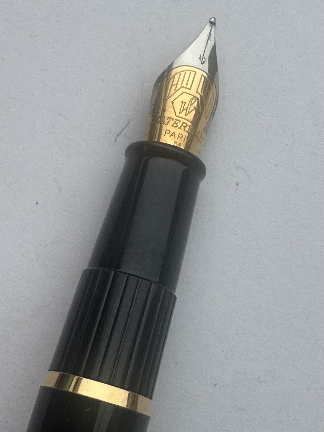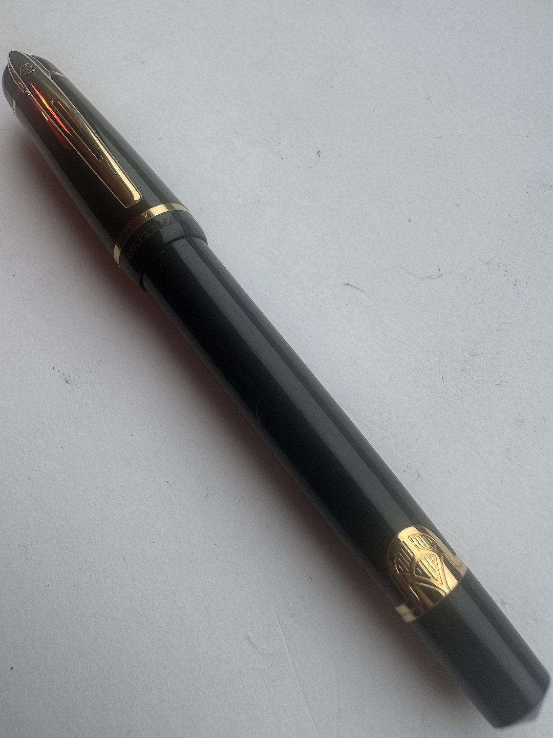Moderne sort Waterman fyldepen. Lavet i Frankrig. Cartridge blæk-påfylder (blæk-patron). I god stand. Skriveklar når køber har tilkøbt Blæk-patroner. 13,5 cm lang