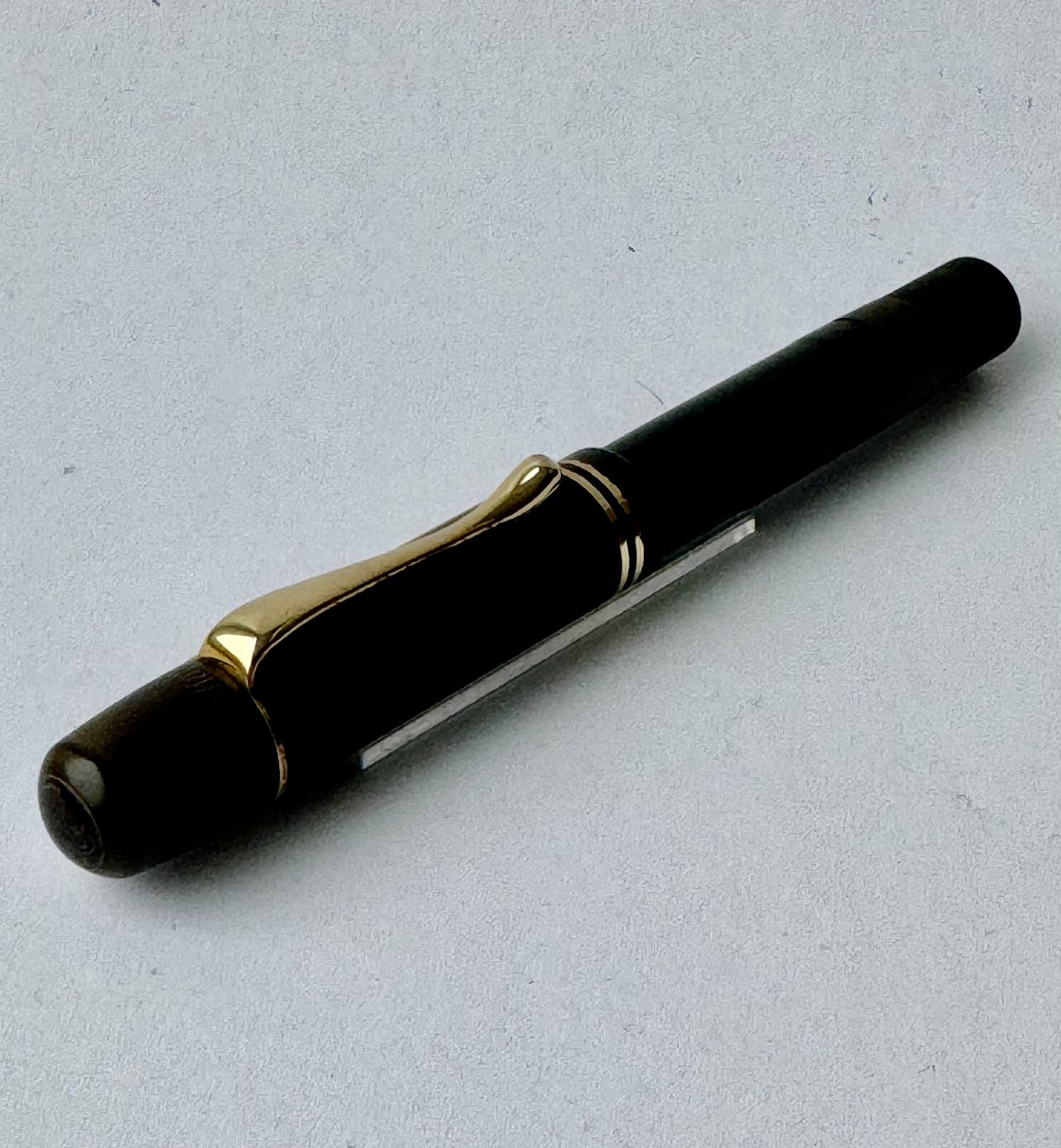 Sort Pelikan 100 fyldepen fremstillet i Tyskland midt i 1930’erne. Piston blækpåfylder. Fremstår i god stand uden skader eller reparationer. Alle dele originale til denne model inklusiv en 14 karat guldspids.