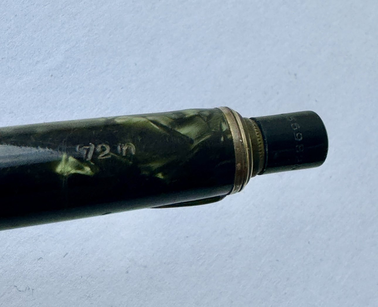 Grøn marmoreret Montblanc Pix 72n skrueblyant / stiftblyant / pencil fra slutningen af 1940’erne. Fremstår i god stand og klar til at blive brugt. Har et par løse “mavebælter”, der dog ikke ændrer på funktionalitet. Længde 12,8 cm