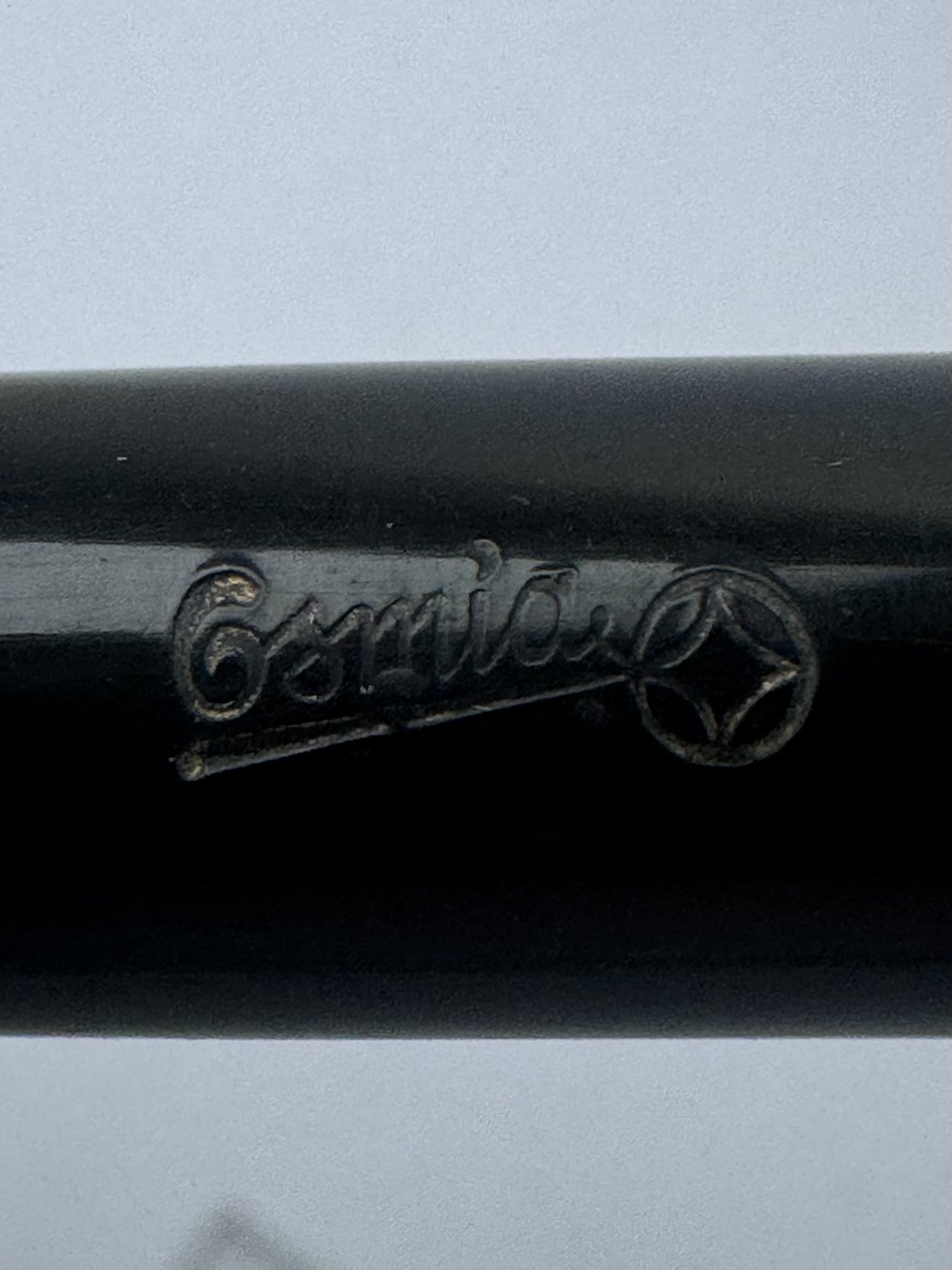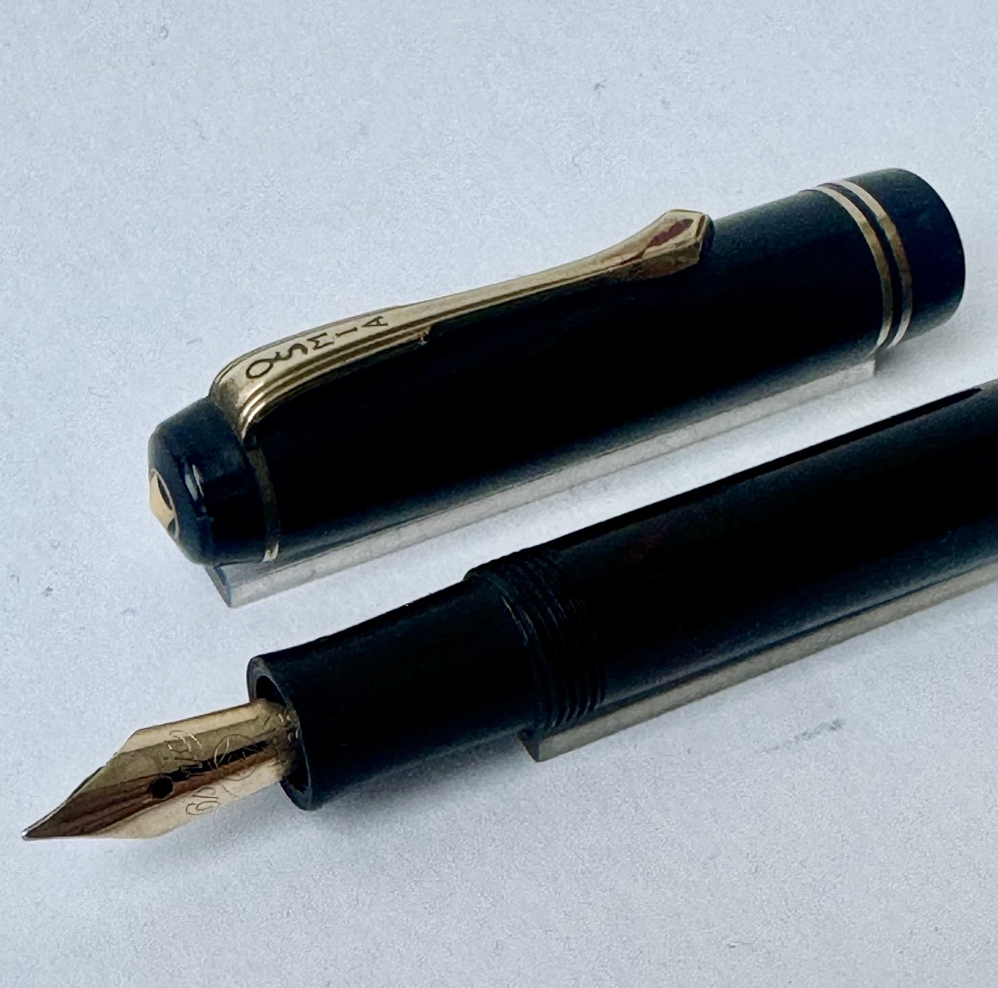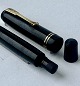 Sort Osmia fyldepen med piston blæk påfylder, der skal repareres før end fyldepennen igen kan optage blæk og skrive igen. Fremstår i god stand uden skader. Alle dele originale til denne model inklusiv en Osmia nummer 2 guldspida i 14 karat. Længde: 11,5 cm