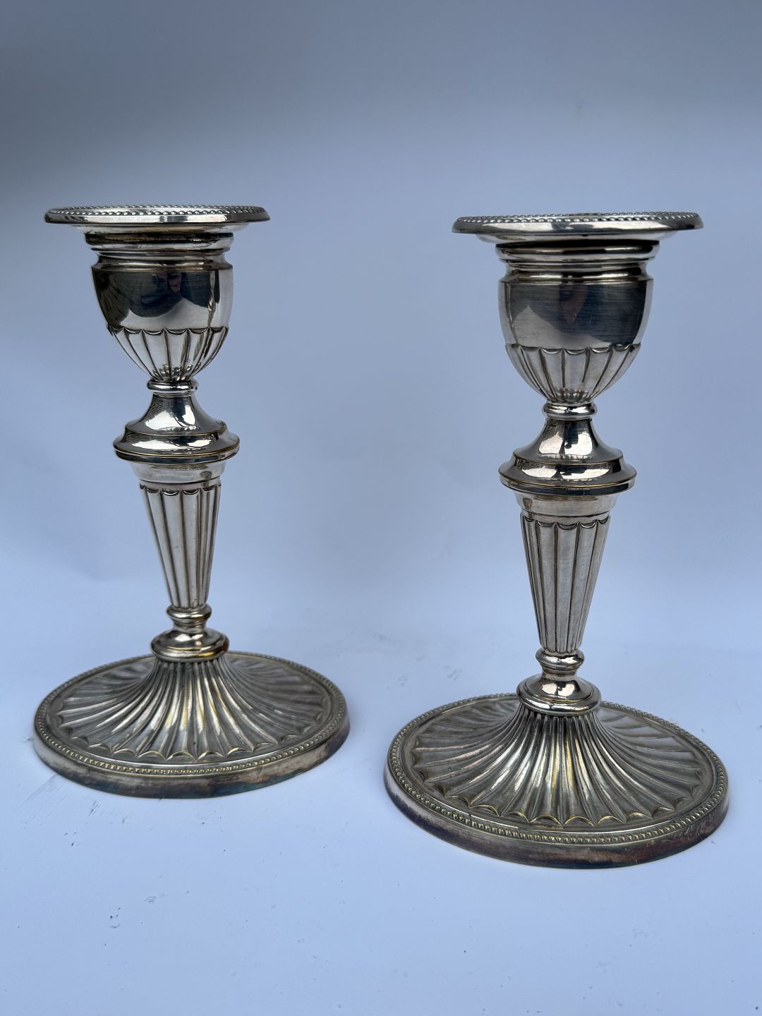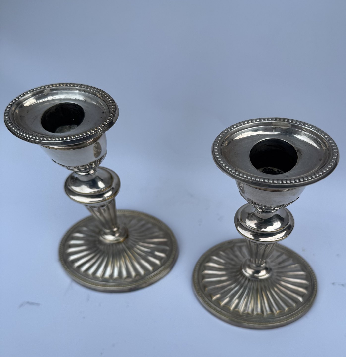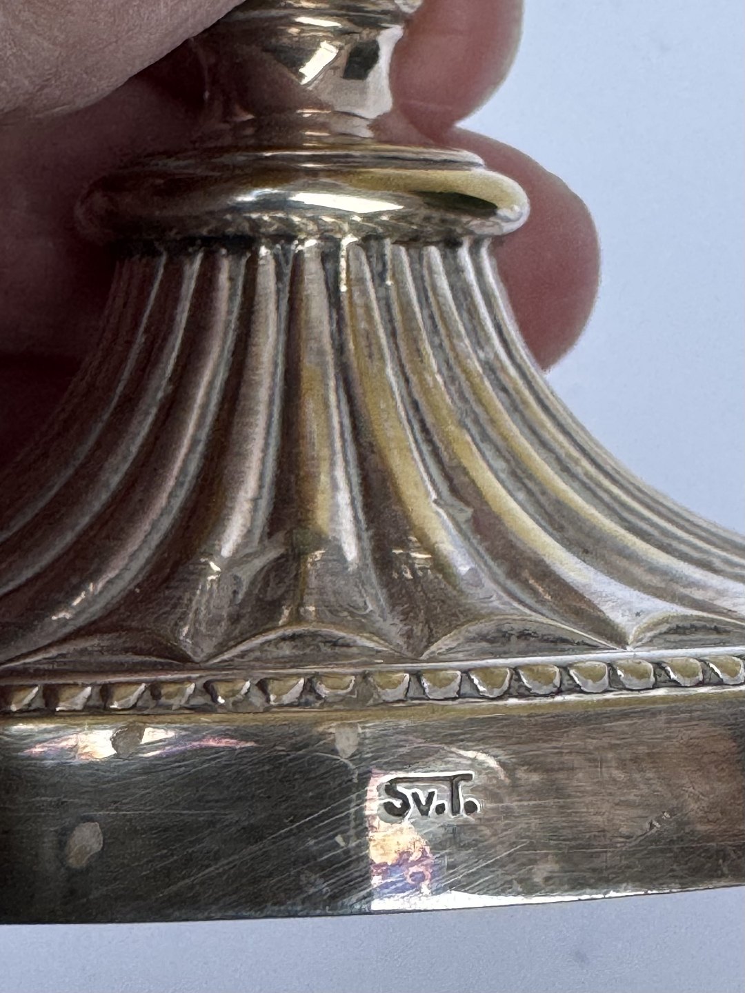 Par lysestager i sølvplet designet af Svend Toksværd. I god stand uden skader eller reparationer. Almindelig brugsspor på overfladen. Signeret Sv. T. Højde: 17 cm