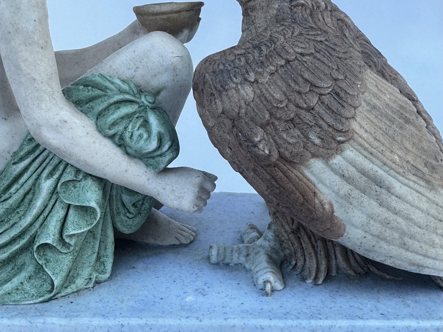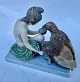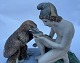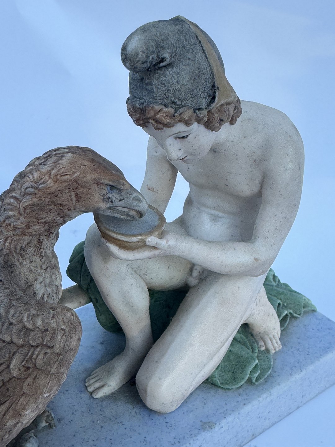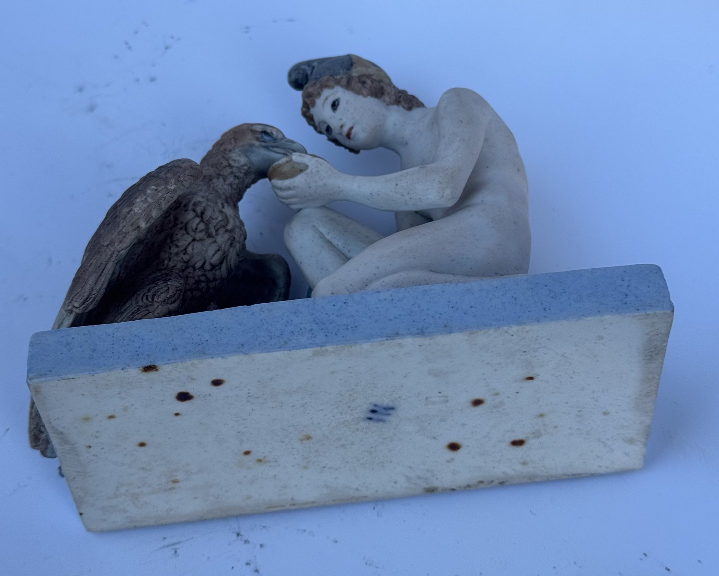Figur i bemalet bisquit porcelæn forestillende Ganymedes med Jupiter’s (Zeus’ i følge den græske mytologi) ørn af Bertel Thorvaldsen (1770-1844) Formgivet i Rom 1817-18. Denne reproduktion er fra Royal Copenhagen fremstillet i slutningen af 19. århundrede. Ifølge den græske mytologi bortfører Zeus’ (Jupiter) ørn Ganymedes for at for at gøre ham til gudernes mundskænk (tjener). Fabriksmærket på bunden med fabrikkens velkendte tre blå bølger. Figuren mangler Ganymedes’ kande i højre hånd, ligesom der er et mindre afslag på ørnens hale. Mål: H. 11 cm. Basen måler 6 x 12,5 cm.
