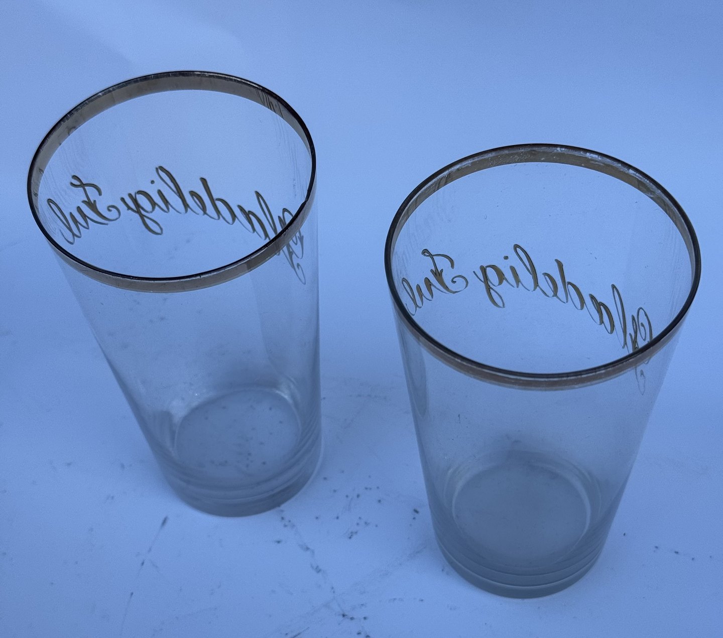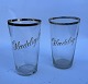 Par vandglas fra Fyens Glasværk ca. 1920. Begge med emaljeret tekst “Glædelig Jul”. Det ene glas har to små skår på den guldbelagte kant (se foto). H. 12,4 cm