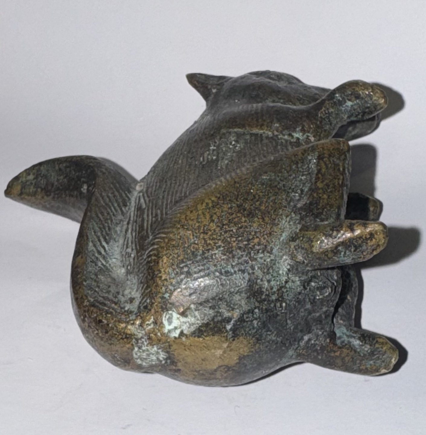 Figur af siddende egern udført i bronce. Formodes fremstillet omkring 1900. Oprindelse ubekendt. Fremstår i god stand uden skader eller reparationer. H. 8,5 cm Vægt 263 gram.