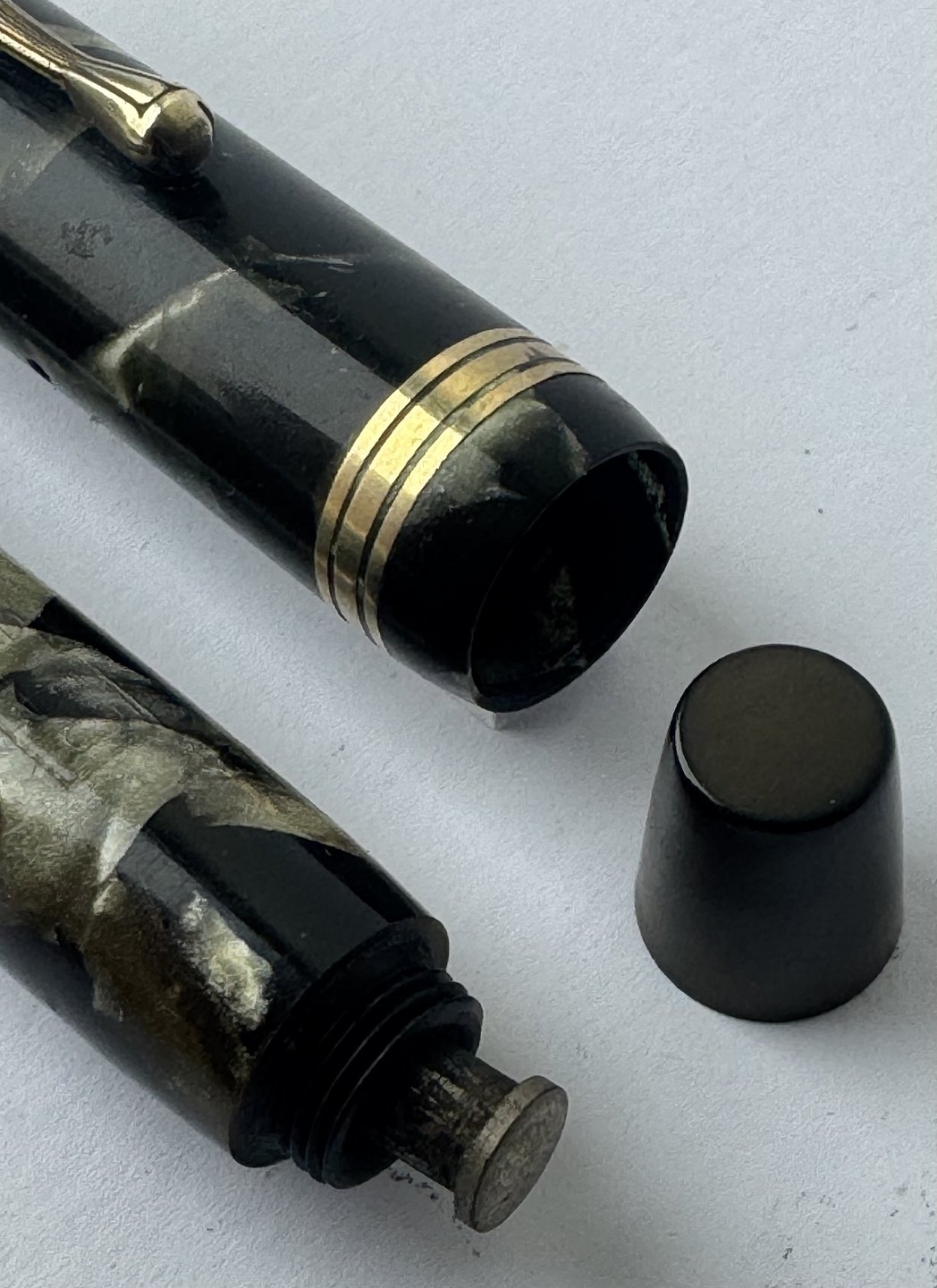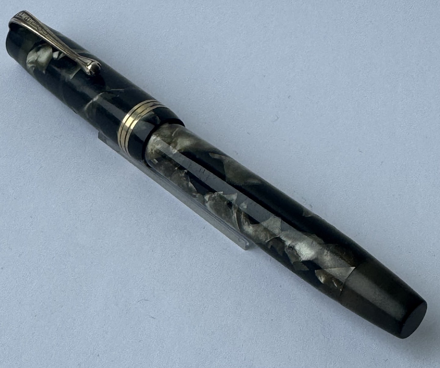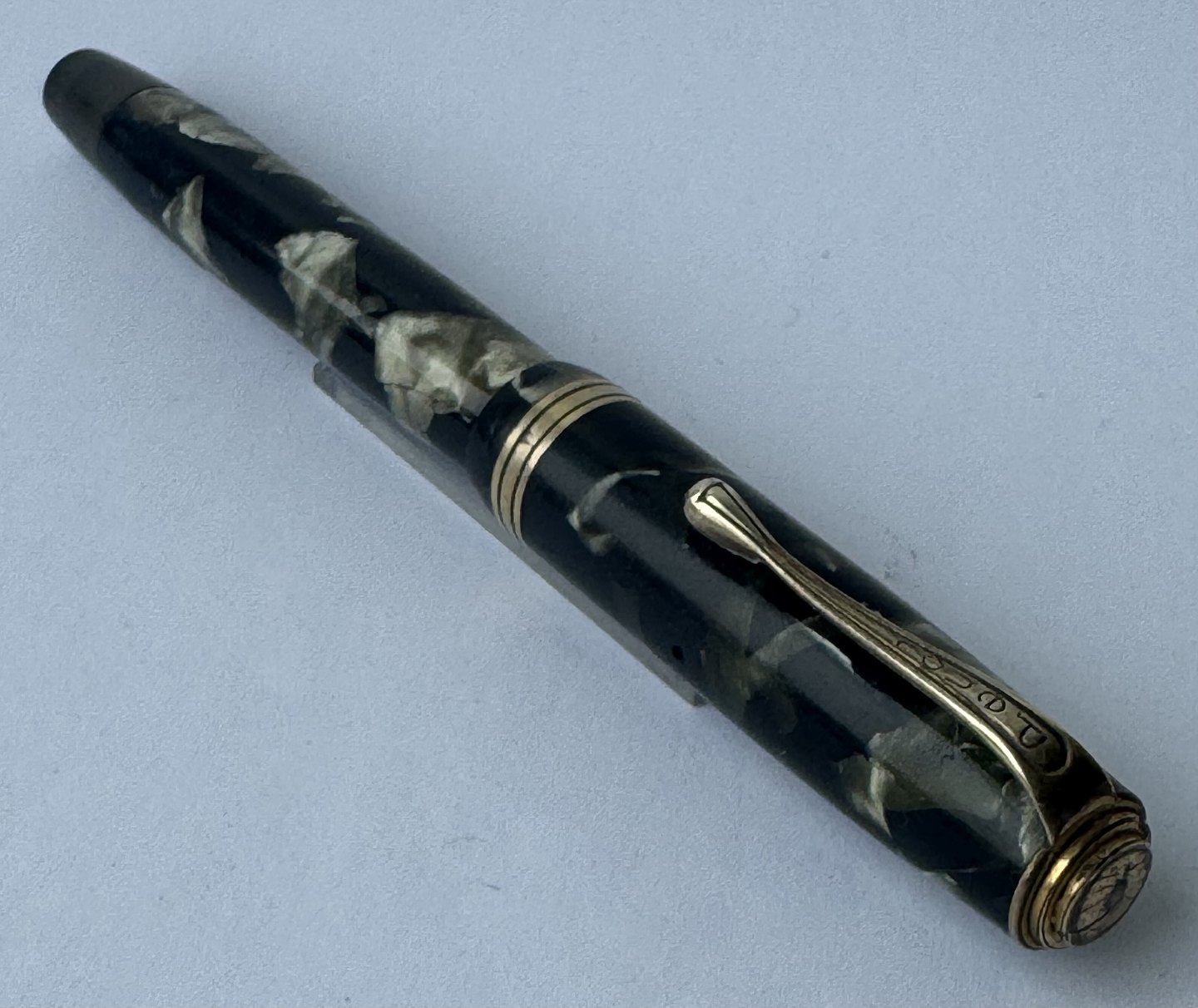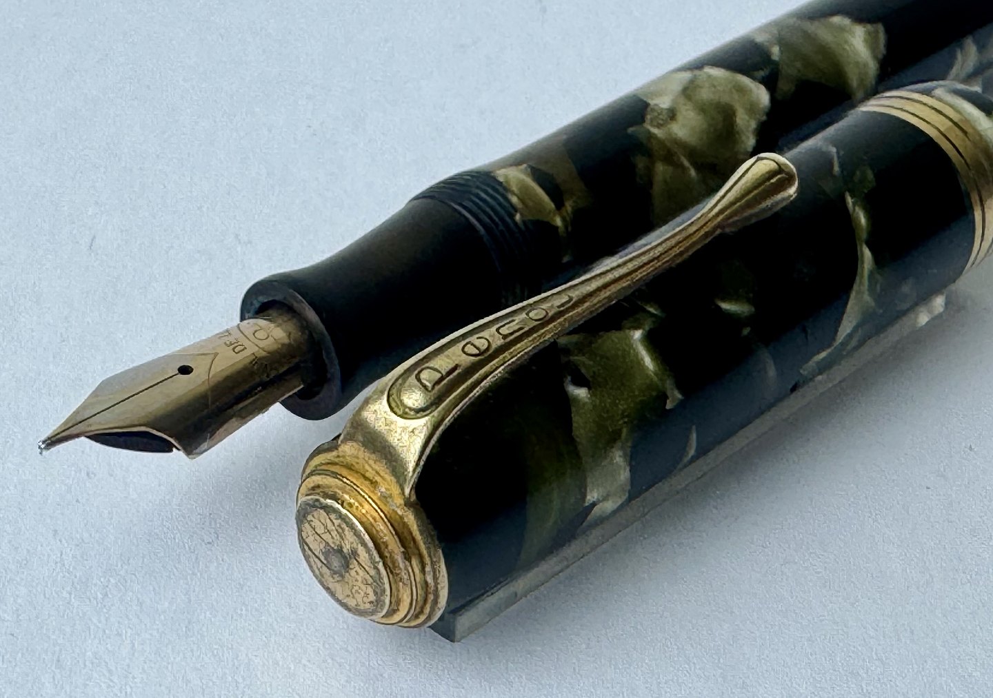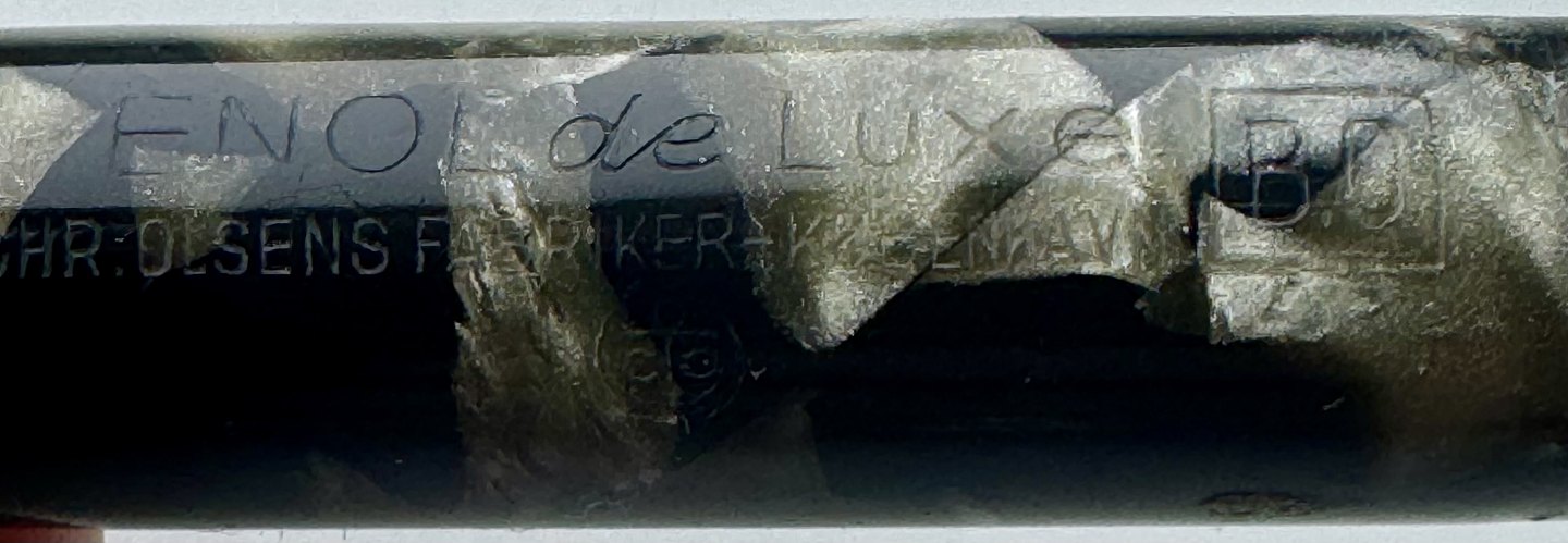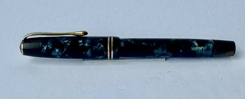 Grøn marmoreret Penol de Luxe fyldepen. Produceret på chr. Olsens fabrikker i København omkring 1945. Push button filler. Der skal indsættes en ny gummisæk før den igen kan optage blæk og skrive igen. Ny gummisæk kan indsættes for et tillæg på kr. 250,- Alle dele originale til denne model. Ingen skader eller reparationer. Lette almindelige brugsspor på overfladen. Længde 12,5 cm