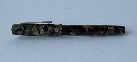 Mindre kantet og grøn-marmoreret Eversharp fyldepen og pencil. Der ses en mindre revne ved åbningen på fyldepennen hætte. Eller ingen defekter. Der skal indsættes en ny gummisæk før end den fungerer igen. Ny gummisæk kan indsættes for et tillæg på kr. 200,- Fyldepennen er 11 cm lang.