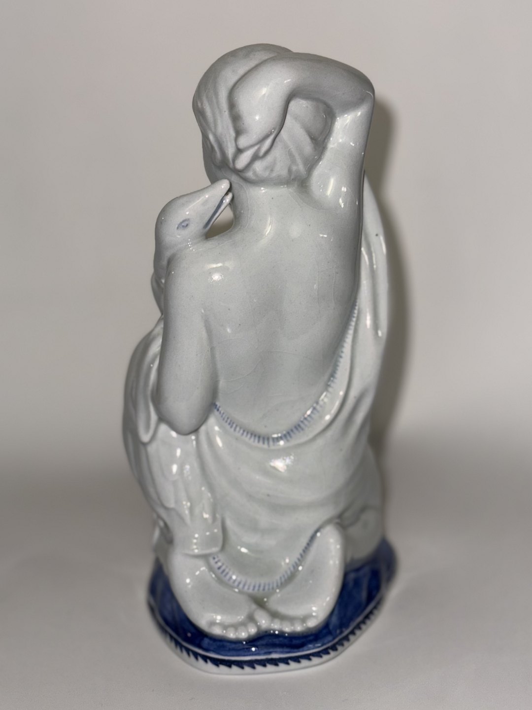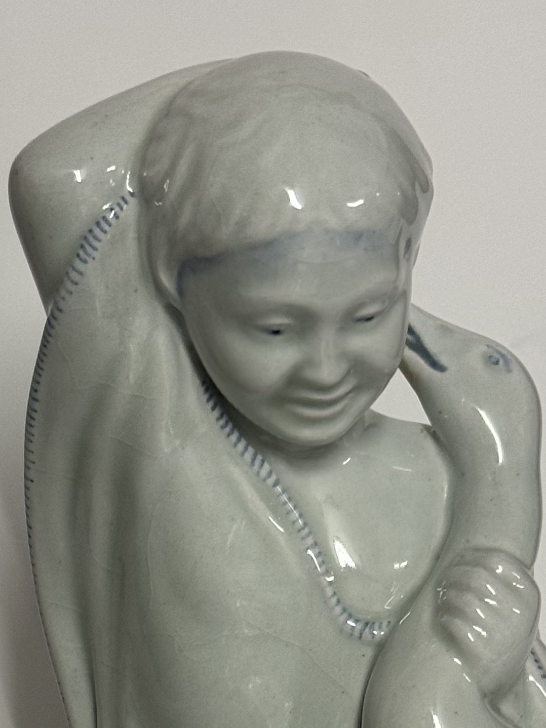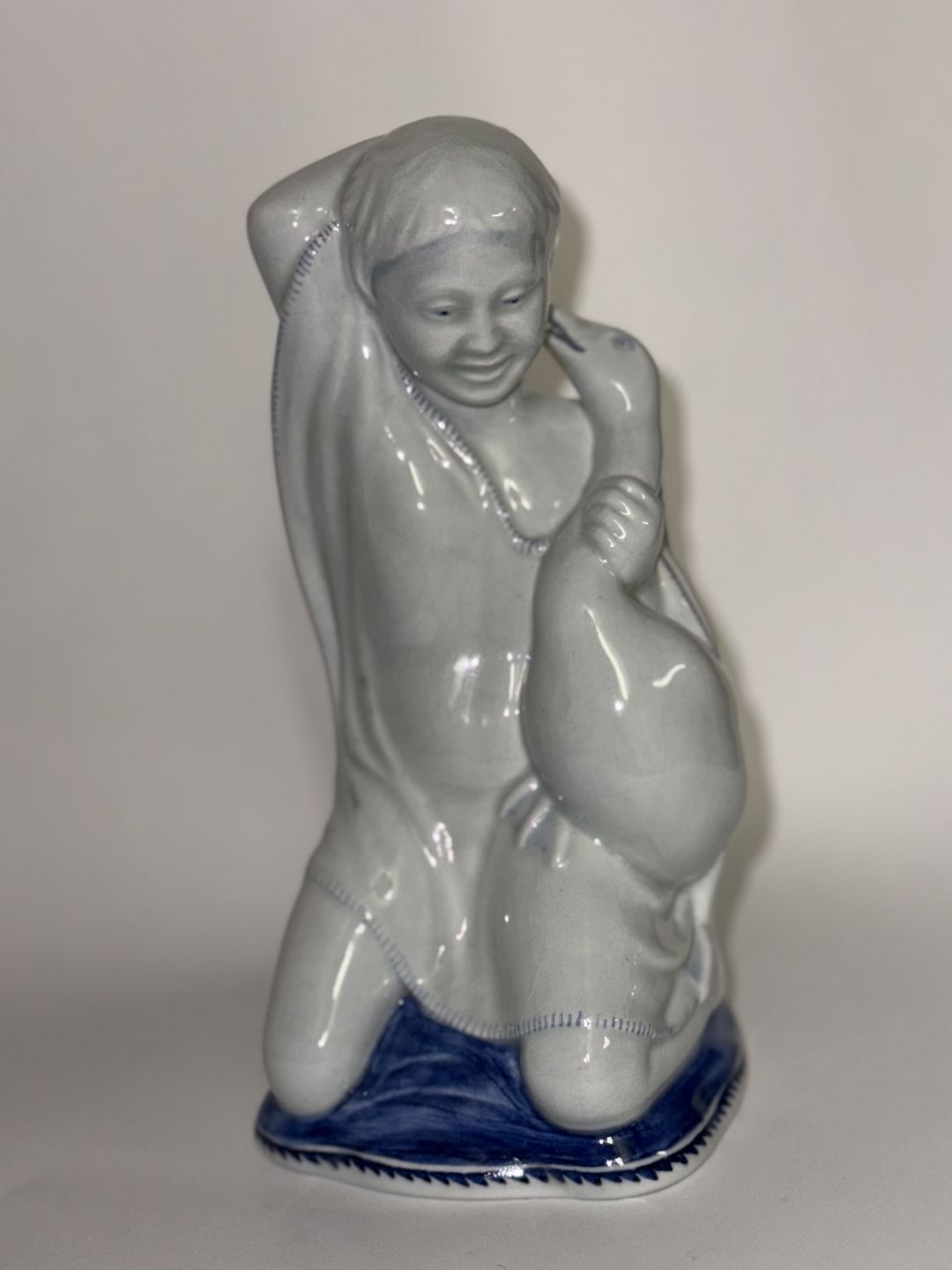 Faience figurine depicting a young girl on her knees with a goose in her lap. Made for Aluminia by the Danish sculptor Michael Pedersen (1882-1918). Slightly cracked. Factory mark on the bottom with logo and model number 4017/1253. In good condition without damage. 1st. Quality production. H. 16 cm.