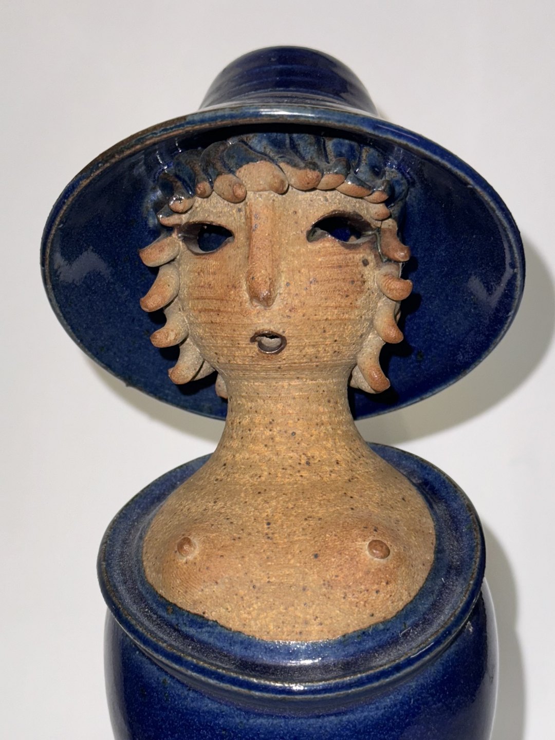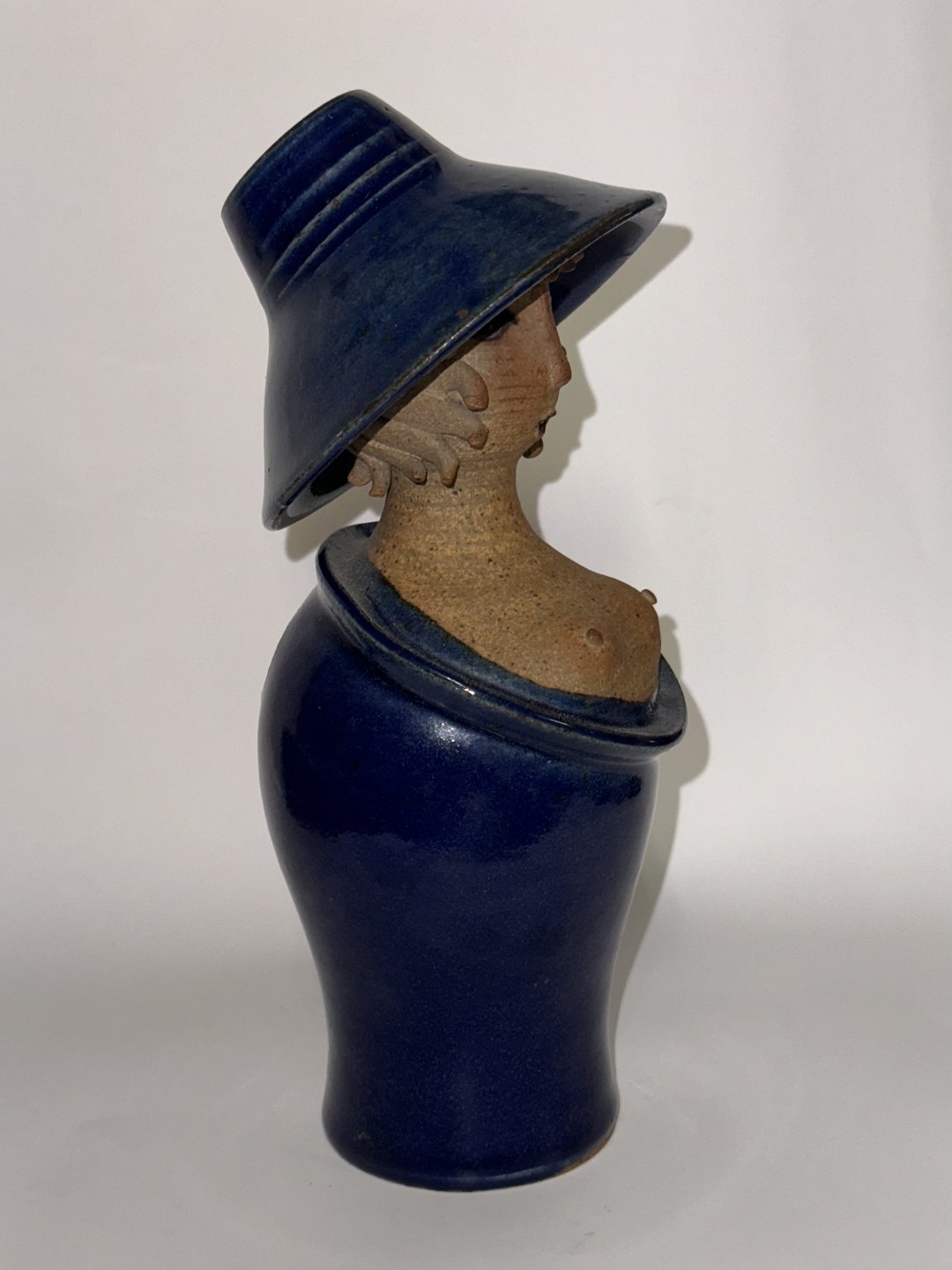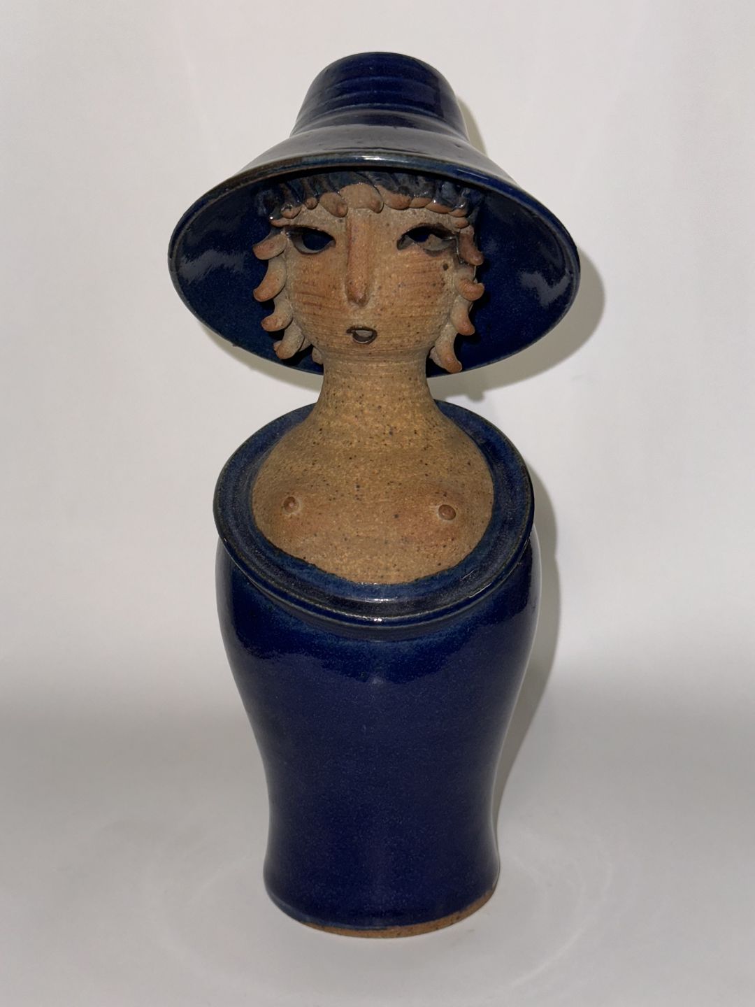 Ceramic figure of a woman with a hat. Appears in good condition without damage. Designed by Jacob Bang, who created several similar figures in different poses. This version with blue glaze. Hole in the back for flowers, for example. Stamped on the bottom with the artist's name and model number 14 and DANMARK. H. 21 cm