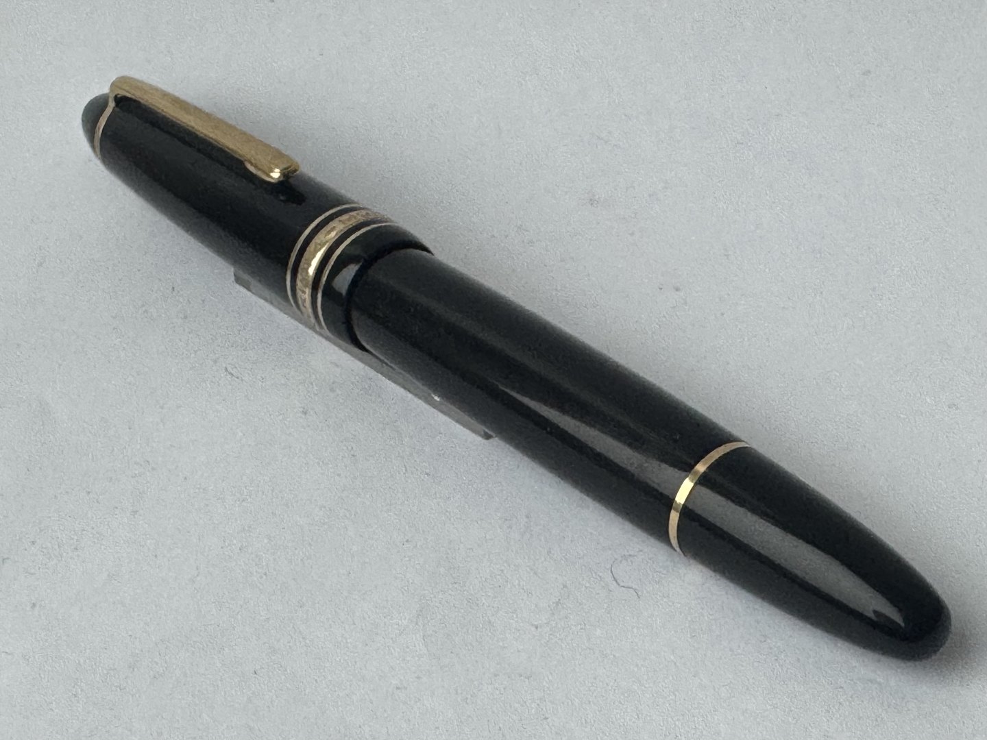 Black Montblanc Meisterstück LeGrand fountain pen with all original Montblanc parts including a large 14 carat gold nib. Ink filling with piston filler. In good condition and ready to be use. L. 14.3 cm.