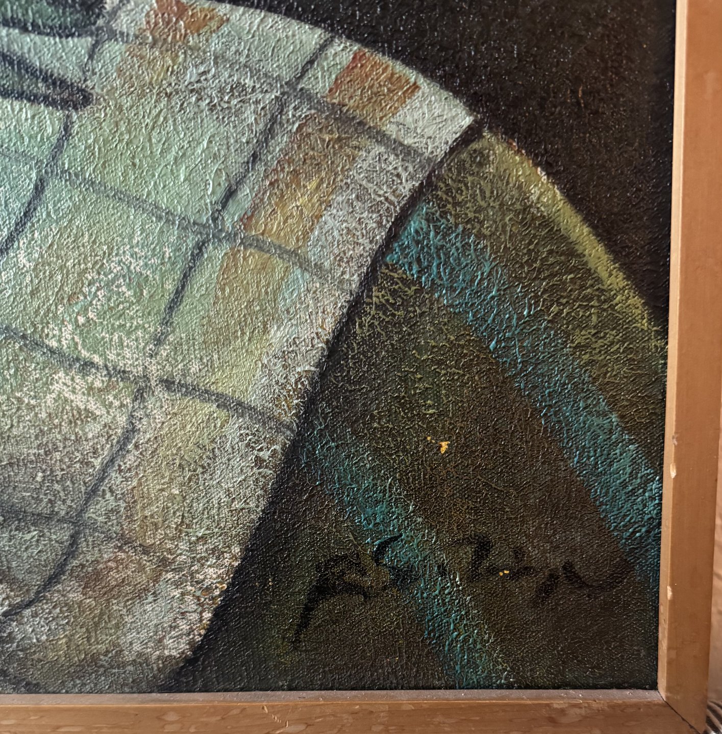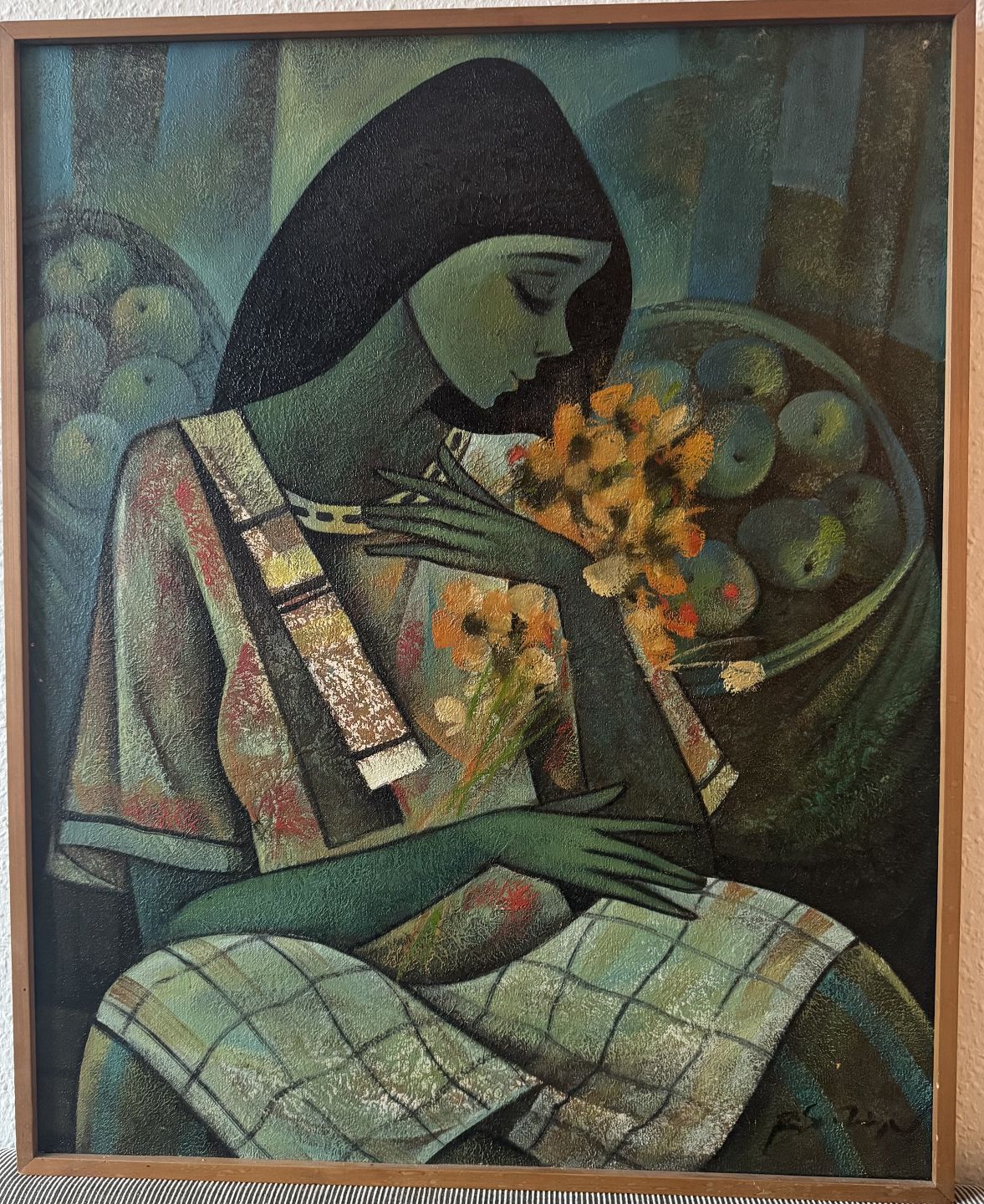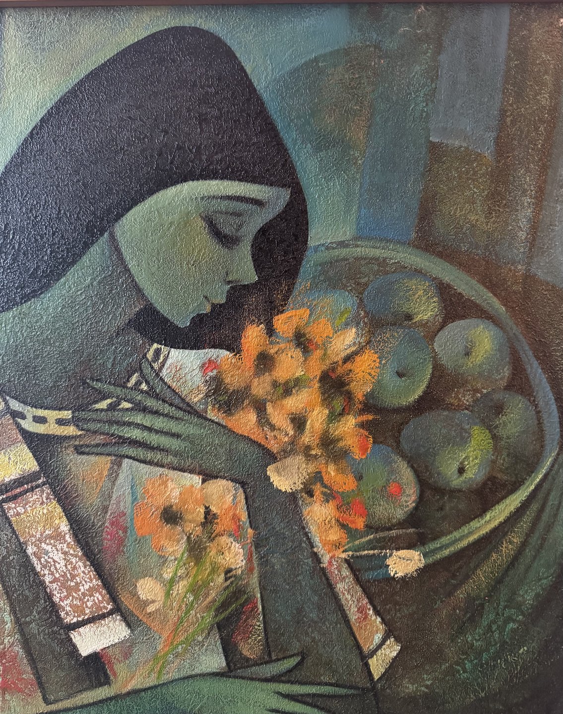 Portrait of a young woman with a bouquet of flowers and baskets of apples around her. Dimensions: 61.5 x 75.5 cm.