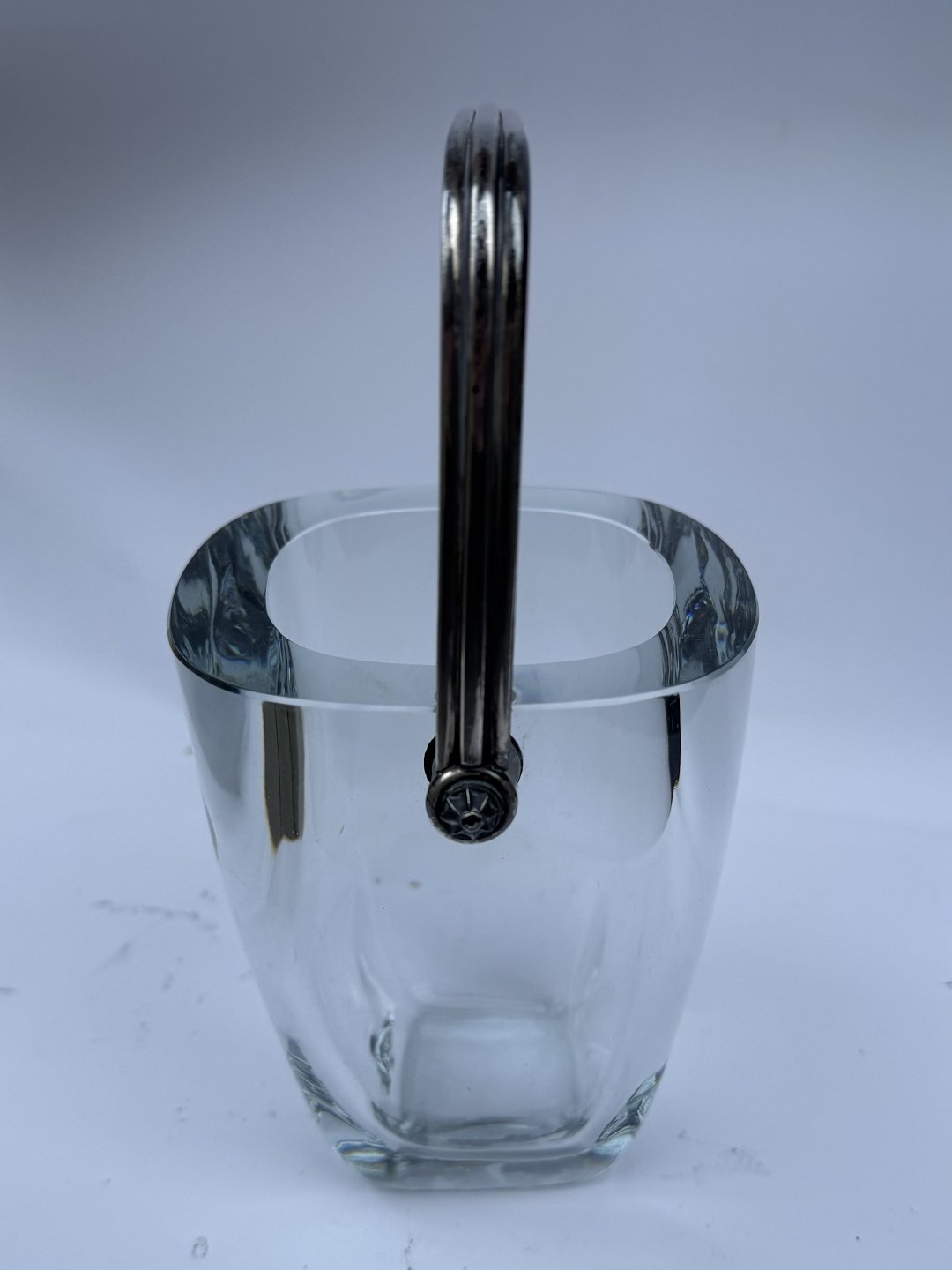 Glass ice bucket from the Swedish Strömbergshytten with sterling silver handles by E. Dragsted. In good condition.