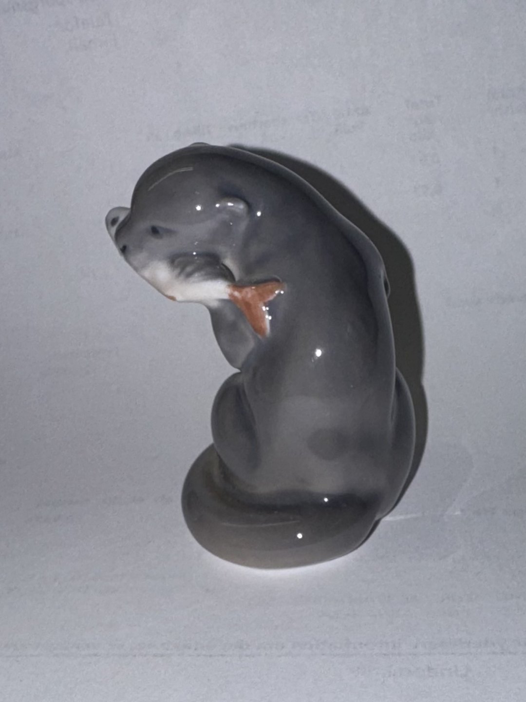 Porcelain figurine of an otter with a fish in its mouth from Royal Copenhagen. Factory “second” production. In good condition without damage or repairs. Factory mark and Model number 2333 on the bottom. H. 5 cm