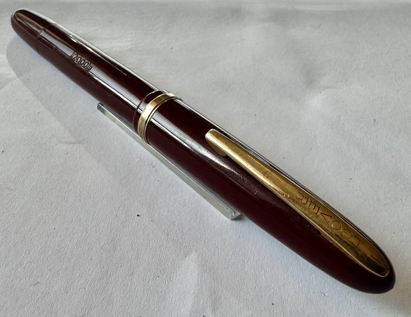 A vintage fountain pen ready to be used: Burgundy Hoover no. 891 fountain pen with piston filler ink filling system. All parts original. Almost unused. Length 13.3 cm.