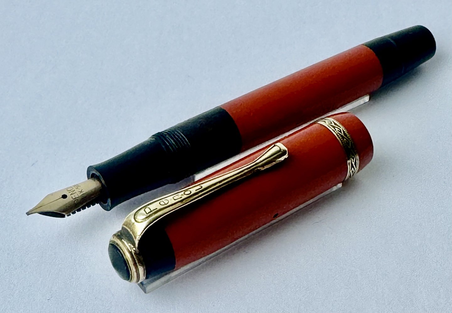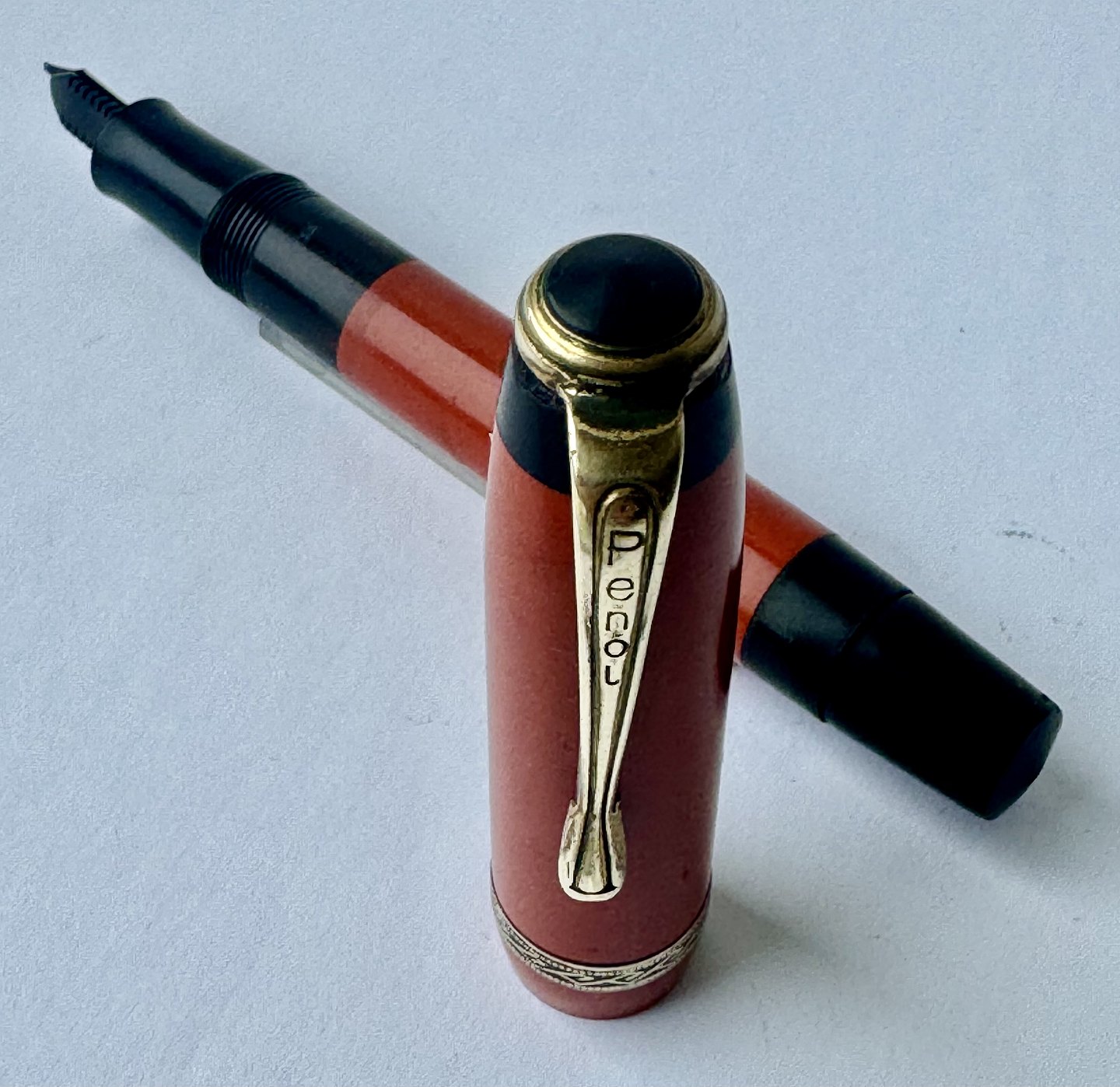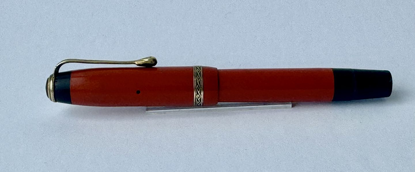 Small coral red Penol Junior 12 fountain pen. Push button filler. A new rubbersack must be inserted before it can absorb ink and write again. All parts original to this model. No damage or repairs. Normal surface tracks of use. Text on the barrel almost worn away ! Length 11.7 cm