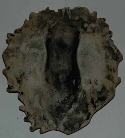 Julepynt - Platte til ophæng på væggen. Keramik relief af smilende julemand med teksten: Glædelig Jul. Ingen fabriksmærke. Formoder den er fremstillet omkring år 1900. I perfekt stand. 17 cm høj og 14½ cm bred.