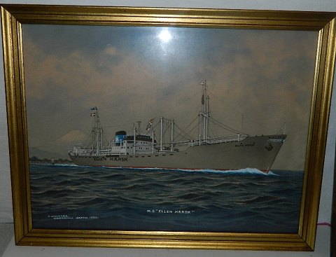 Hagiwara: "Ellen Mærsk", skibsportræt. Sign. T. Hagiwara, Yokohama Japan 1953. Gouache på silke. Mål 36 cm x 47 cm
