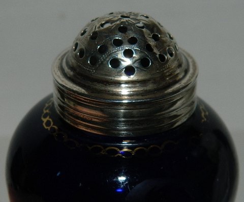 Sukkerbøtte i glas med låg i sølvplet. Rester af gulddekoration på glasset med teksten "SUGAR". Guldet på bogstaverne er dog bortvasket, men teksten anes stadigvæk. Glasset er usædvanligt tungt. I god stand uden skader eller reparationer. Fremstillet midt i 19. århundrede. 12 cm høj.