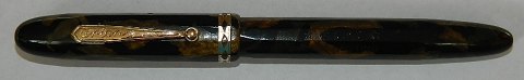 10-sidet brun/sort marmoreret Orion Everlasting no. 563 fyldepen. Push button fylder. Ny gummisæk skal indsættes før brug. I god stand. Uoriginal Orion nib (Parker). 13½ cm lang.