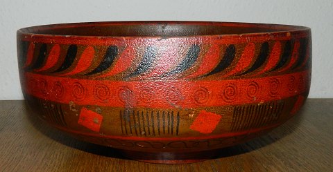Stor bemalet russisk skål i træ fra begyndelsen af 20. århundrede. Fremstår i god stand med almindeligt brugsslid. Ingen skader eller reparationer. Skålen er 12 cm høj og åbningsdiameteren er 27 cm.