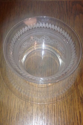 Glasskål på tilhørende fad. Begge dele dekoreret. Fremstår i perfekt stand. Skålen er 8 cm høj og ø. Diameter på 14 cm. Fadet er 18 1/2 cm i diameter.