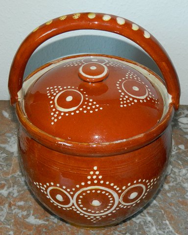 Dansk barselspotte i keramik fra ca. 1880. Fremstår med brugsslid - skår og revner som vist på fotografierne. 29½ cm høj