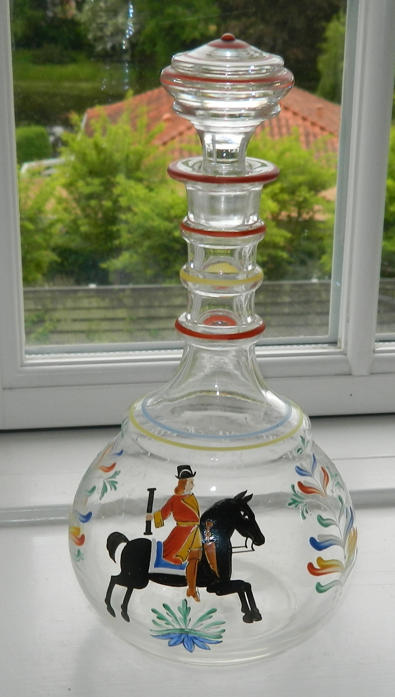 Glaskaraffel fra Holmegaard Glasværk med emaljedekoration med postrytter i oldenburgske farver på forsiden og på bagsiden indgraveret "Mod og Kraft gi´er denne Saft". Formodes fremstillet ca. 1940. Både karaffel og prop i god stand uden skader eller reparationer. På bunden "kugleslebet". 26 cm incl. prop.