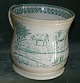 Ældre krus i fajance med hank. Landlig dekoration med køer på mark. Fabriksstemplet (utydeligt) på bunden. Almindeligt brugsslid og krakkeleringer. Ingen skader eller reparationer. Mål: 19 cm højt