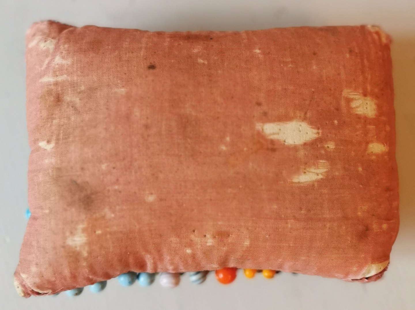 Gammel nålepude med mange gamle pyntenåle. Mål: H. 7½ cm L. 17½ cm B. 13 cm.