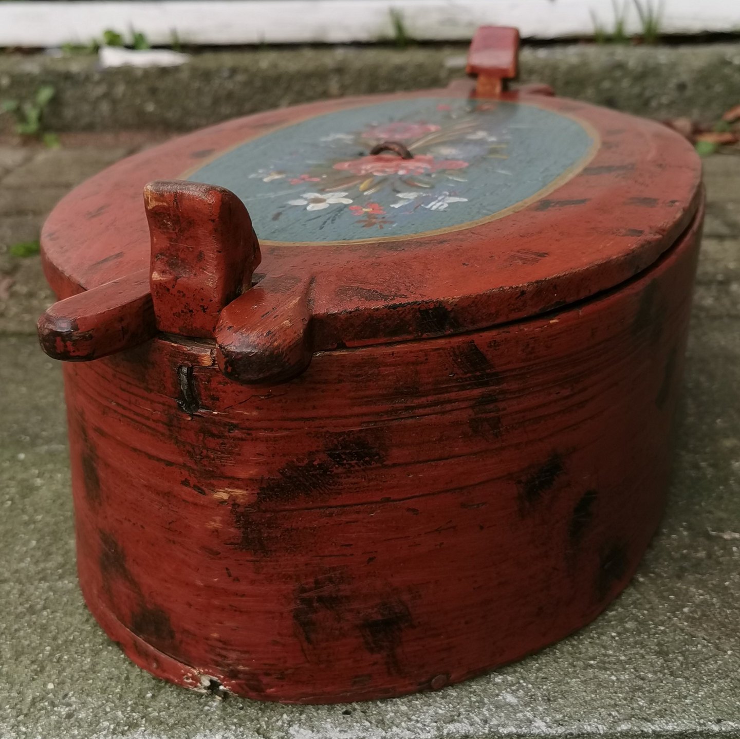 Skandinavisk almue (dansk eller svensk) tejne/madkasse i træ med original bemaling samt motiv med blomster på låget. Formodes fremstillet i midten af 19. århundrede.