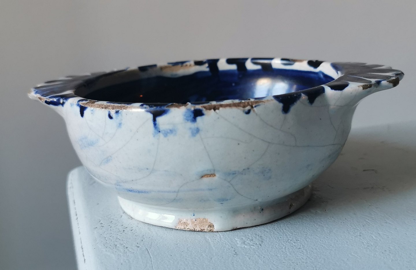 Charmerende øreskål i fajance med dekoration af sejlskib i bunden af skålen. Almindeligt brugsspor på kanten. Ingen skader eller reparationer. Formodes fremstillet Mellemeuropa. H. 5 cm Fra øre til øre: 15 cm.