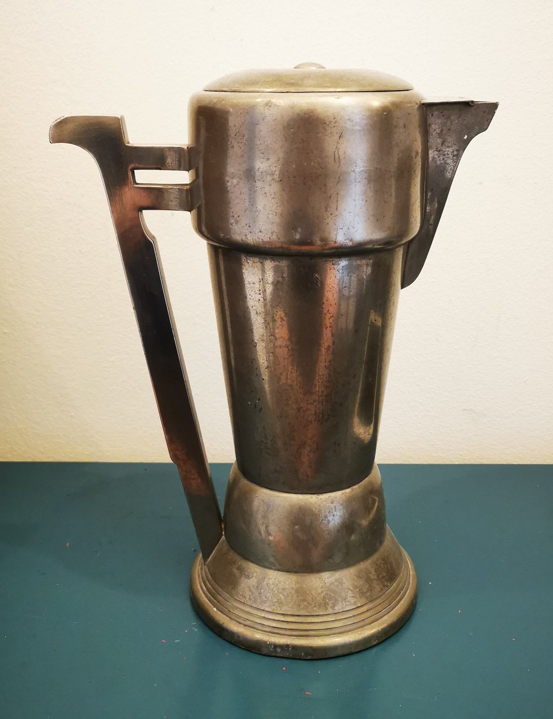 Fremstår i god stand med almindeligt aldersrelateret brugsslid. Ingen skader eller reparationer. Fabriksmærket på bunden med MB 4. Kanden er 30 cm høj.