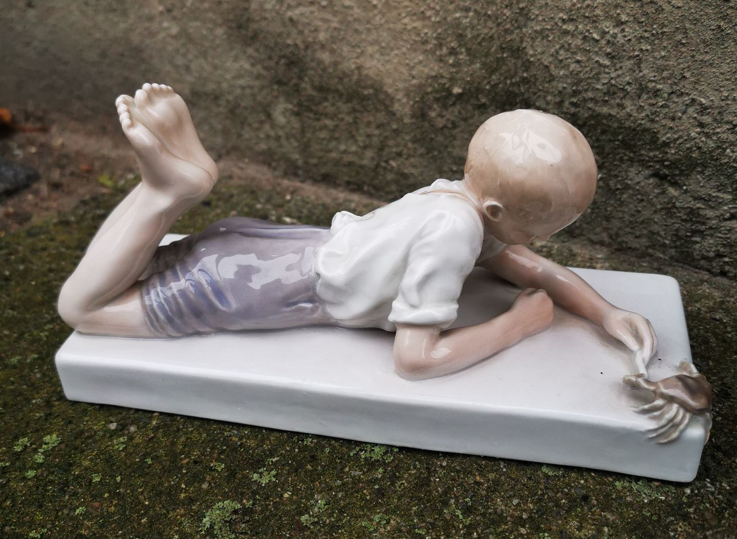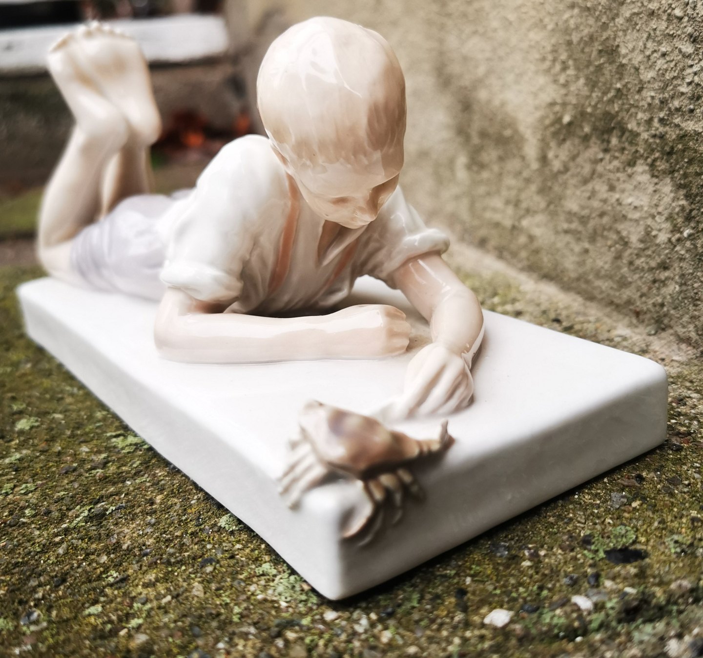 Brevpresser eller brevvægt i porcelæn fra Bing & Grøndahl. Dreng leger med krabbe. Produceret 1914-1915. Fremstår med lille skade. Skår på krabbens højre klo. Ellers i god stand. 1. sortering. Modelnummer 1836. Stemplet bl.a. COPENHAGEN samt B&G i blåt. Mål: 9½ cm høj. Basen måler 8 x 18½ cm.