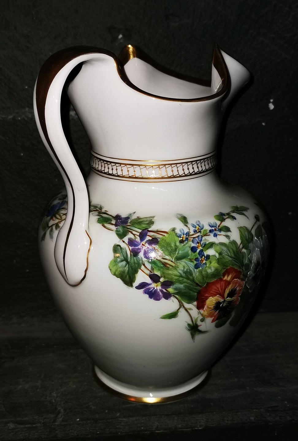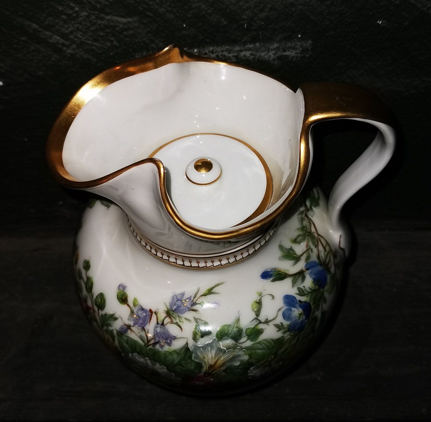 Chokoladekande i porcelæn fra Bing & Grøndahl. Fremstillet i slutningen af 19. århundrede omkring 1880. Dekorations i overglasur med farvestærke blomster. Ingen nævneværdig slid på hverken blomster eller guldet. Låg og kandens bund fabriksmærket med B&G i blåt. Fremstår således i perfekt stand uden skader eller reparationer. H. 23 cm.