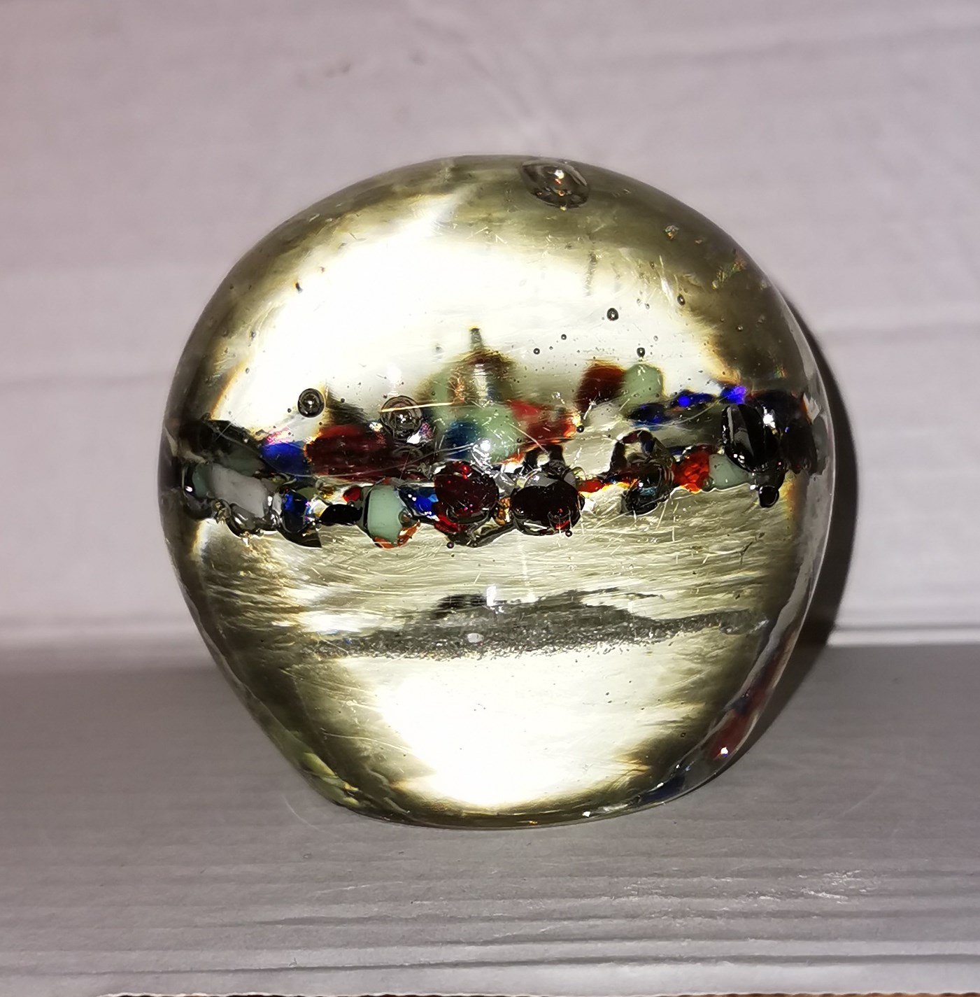 "Fusk" produceret på dansk glasværk omkring 1900: Blomster -og bladværk samt "Putte". I god stand med almindeligt brugslid på overfladen. H. 7 cm.