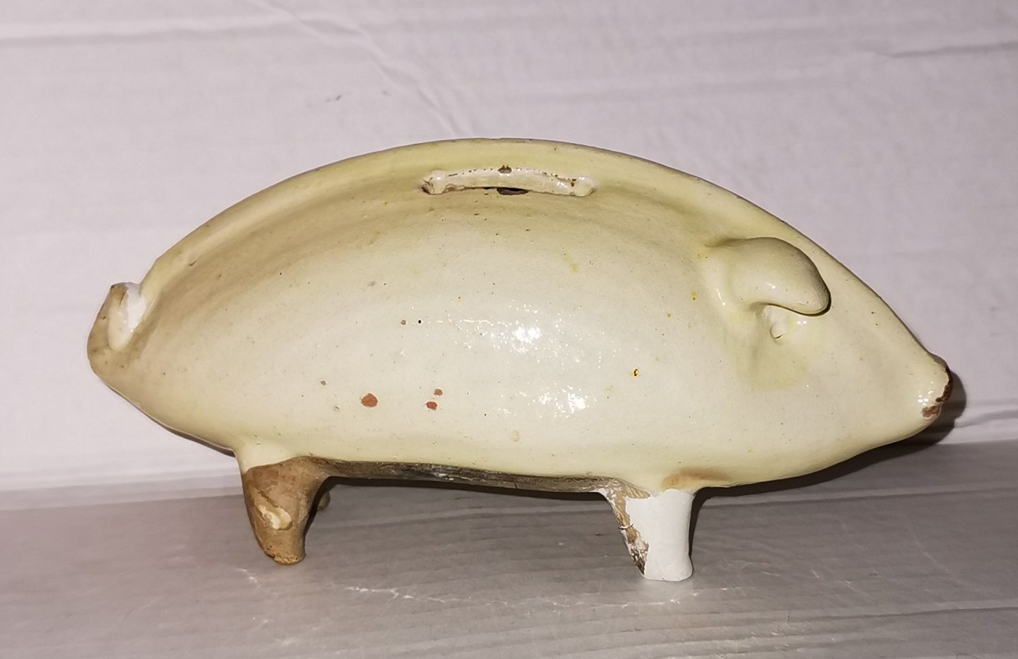 Danks sparegris i glaseret lertøj. Fremstår i god stand med lidt overflade brugsspor. På siden indgravering bl.a. 1915. Mål: H. 8 cm L. 18 cm