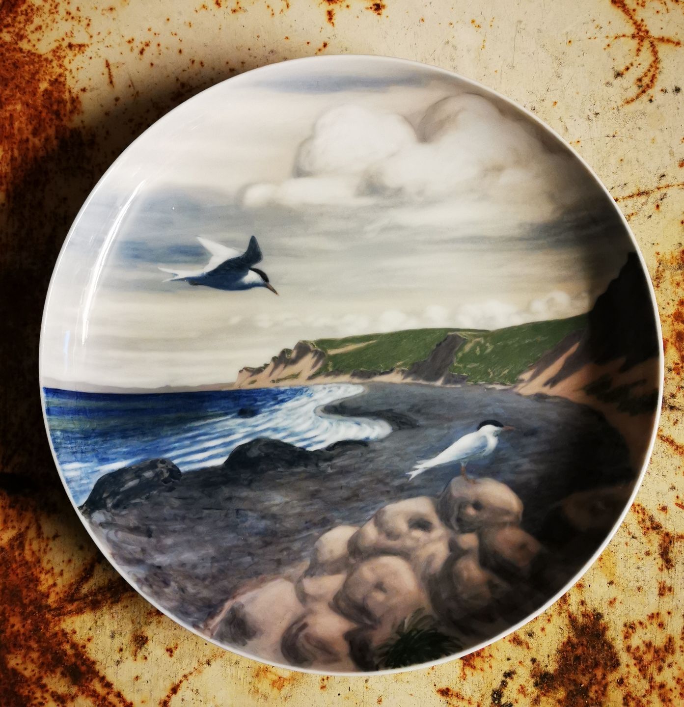 Stor platte fra Bing & Grøndahl bemalet af Harald Viggo Moltke (1871–1960) med motiv af "Fugle ved kysten". I god stand. Ingen skader eller reparationer. Signeret af kunstneren på bagsiden sammen med fabriksmærke. Mål: 32½ cm i diameter (12.79 inches).