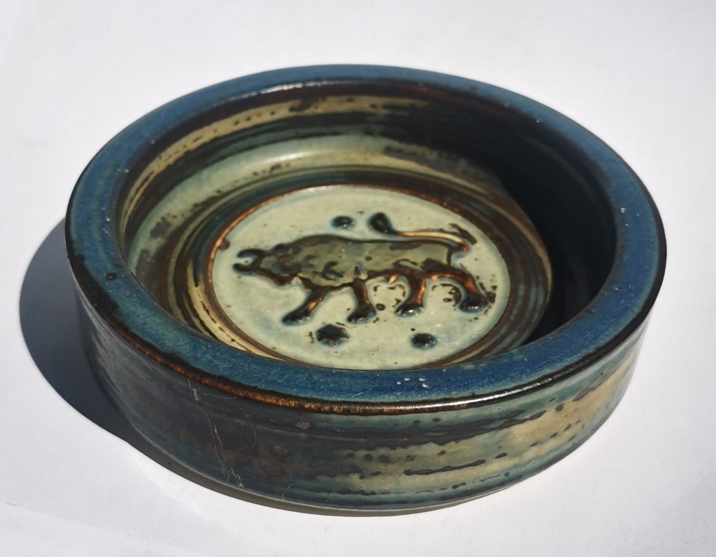 Fad i stentøj fra Royal Copenhagen. I bunden med dekoration af stående tyr. Fremstår i god stand. 1. sortering. Fabriksmærket på bunden. Mål: 4 cm høj (1.57 inches) samt åbningsdiameter på 15½ cm (6.10 inches).