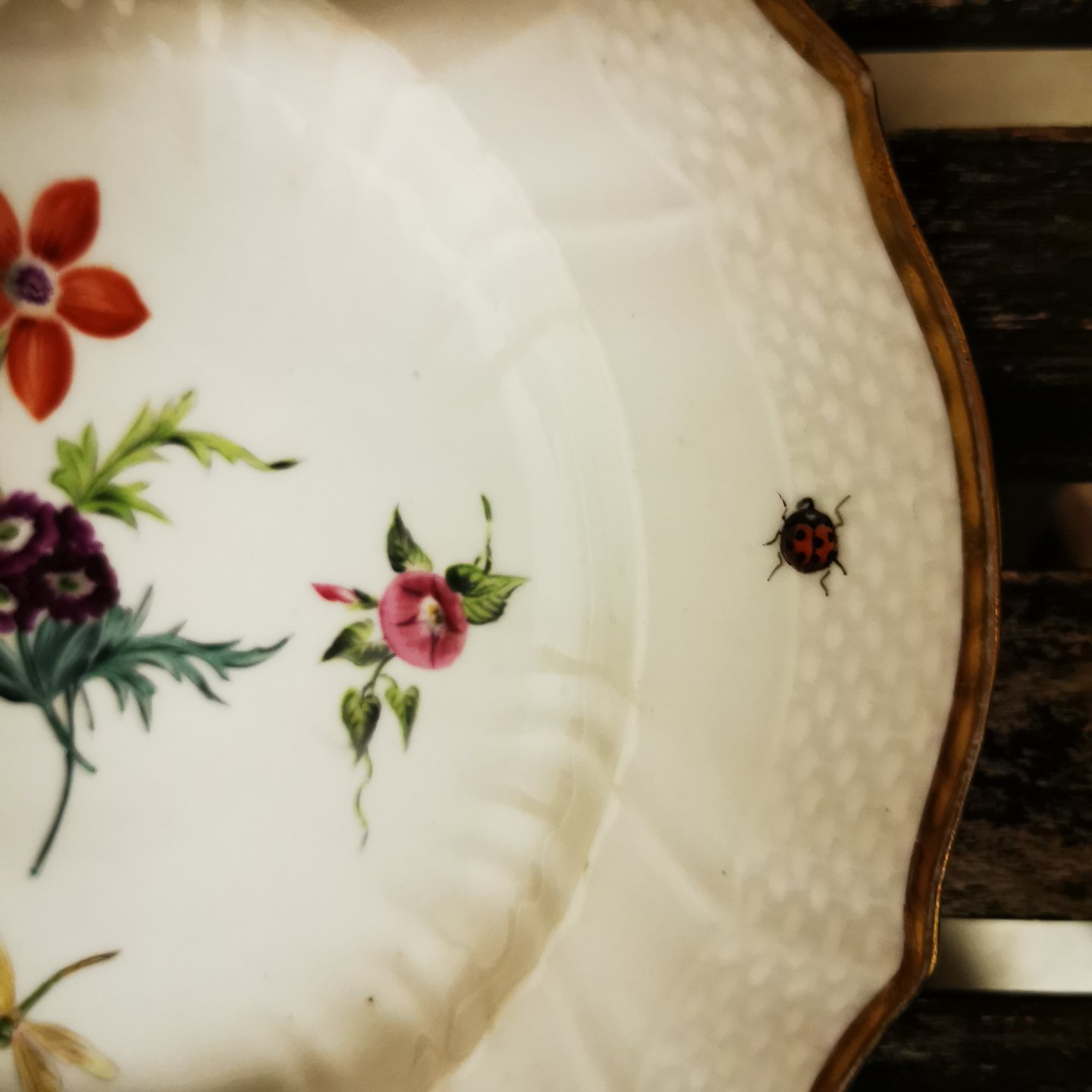 Tallerken i porcelæn fra Ca. 1850 med blomsterdekoration samt sommerfugl og mariehøne. I god stand uden skader eller reparationer. Fabriksmærket på bagsiden med fabrikkens velkendte tre bølger. Ø. 25,5 cm
