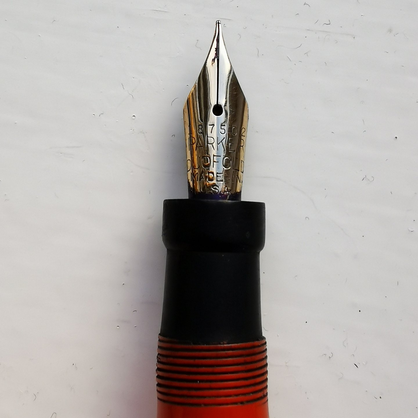 Koralrød Parker Duofold Special Lucky Curve fyldepen. I god stand. Ingen skader eller reparationer. Alle dele er originale. Fungerer ikke. Der skal indsættes en ny gummisæk før end der kan påfyldes blæk igen. Indsættelse af ny gummisæk koster ekstra kr. 200,00. Fyldepennen er 13,5.cm lang
