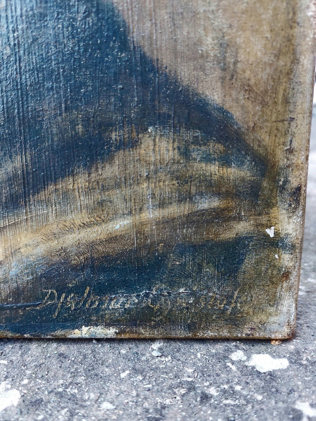 Portræt af dreng med hue på. Olie maleri på lærred. Afskalninger på overfladen. Signeret af ubekendt kunstner. Malet på lærred omkring 1900. Uden ramme. MÅL: 28,5.X 34,5.cm.
