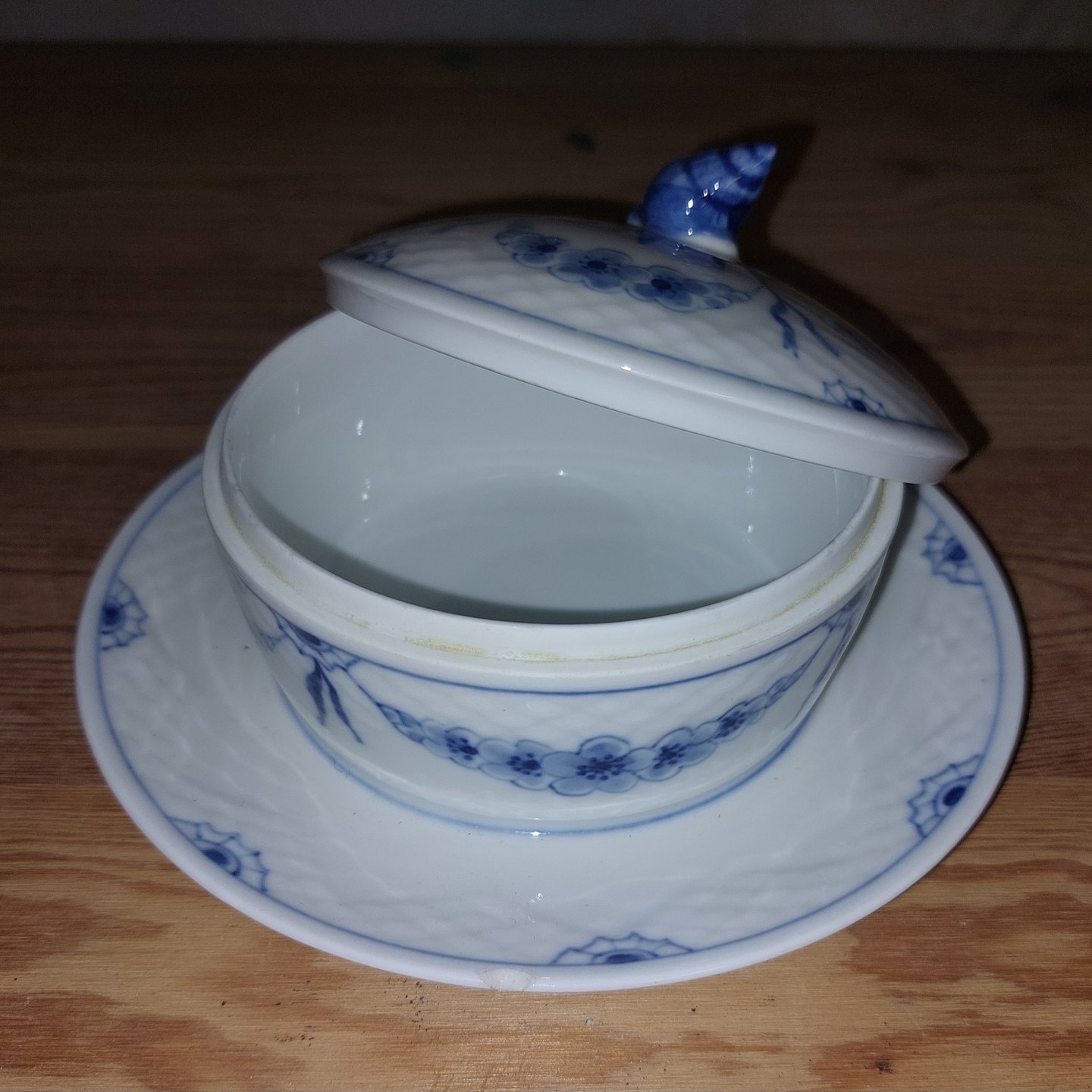 Smørskål i porcelæn fra Bing & Grøndahl fra Empire stellet. 1. Sortering. Har desværre et skår (se fotos). Ellers I orden. Fabriksmærket på bunden/ undersiden. Modelnummer 196. Mål: H. 10 cm Ø. 17 cm