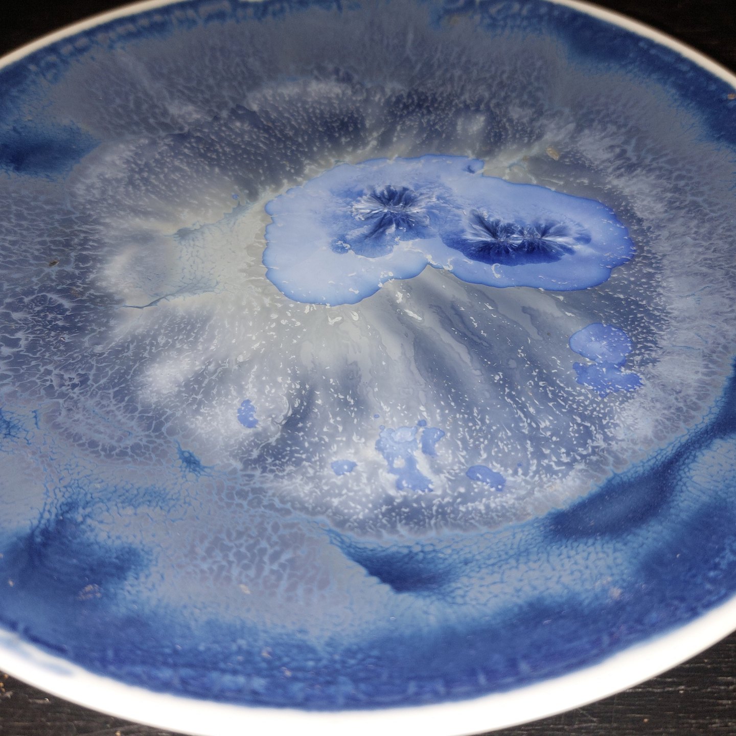 Tallerken eller platte i porcelæn dækket af blå krystalglasur på forsiden. Fremstillet hos Rosenthal, Tyskland i begyndelsen af 20. århundrede. Fremstår i god stand uden skader eller reparationer. Fabriksmærket på bagsiden.