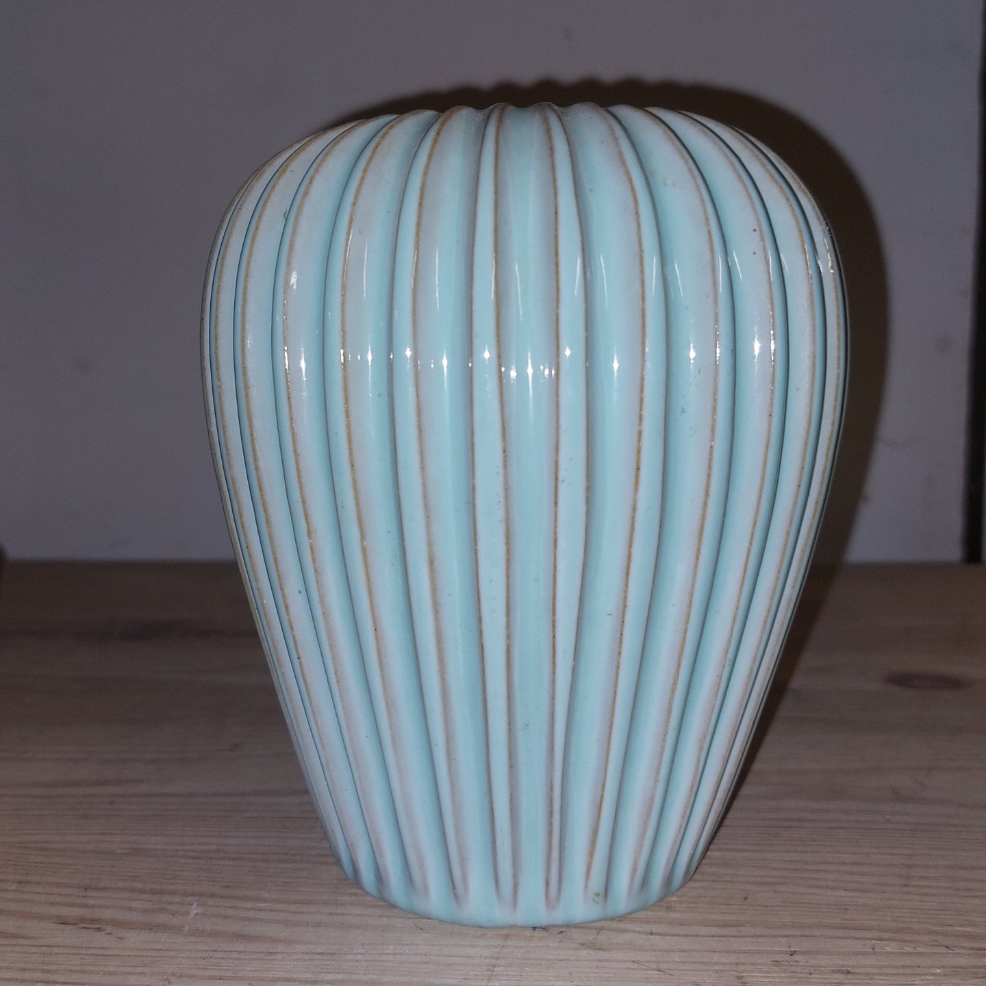 Turkis vase I keramik med den klassisk ribbede dekoration rundt om vase fra Eslau keramikfabrik, Danmark. I god stand uden skader eller reparationer. Fabriksmærket på bunden. 15.cm.