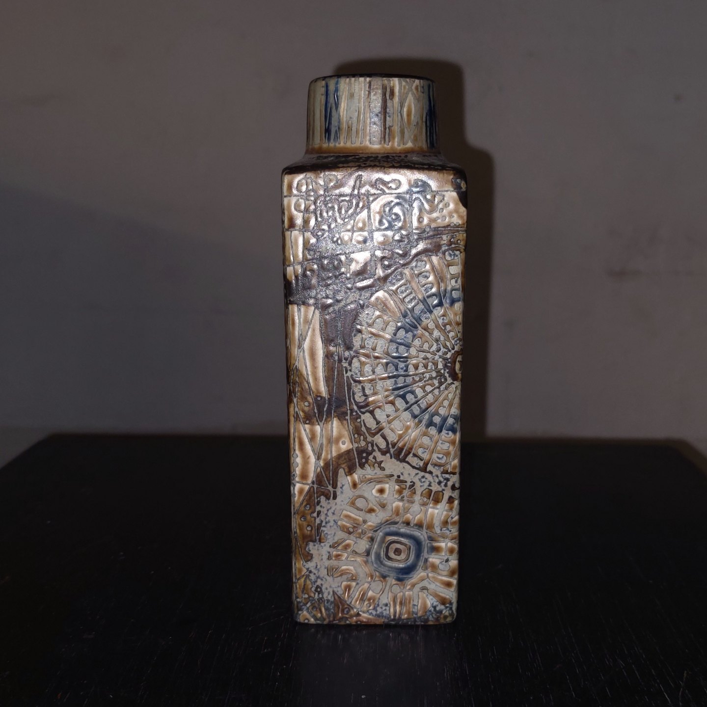 Firkantet Bacca fajance vase designet af svenske Nils Thorsson for Royal Copenhagen. Brun, grå og blå. Vasen fremstår I god stand uden skader eller reparationer. 1. Sortering. Fabriksmærket på bunden. Modelnummer 1455. H. 19 cm