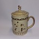Stort Bryllups krus med låg fra Höganäs i Sverige. Låget klinket. Kruset i perfekt stand. Låget dekoreret med hoved. Kruset dekoreret med brudeparrets monogrammer samt med motiver i relief. To "Årstidet" af Bertel Thorvaldsen, samt årstallet 1865..H. 23,5 cm