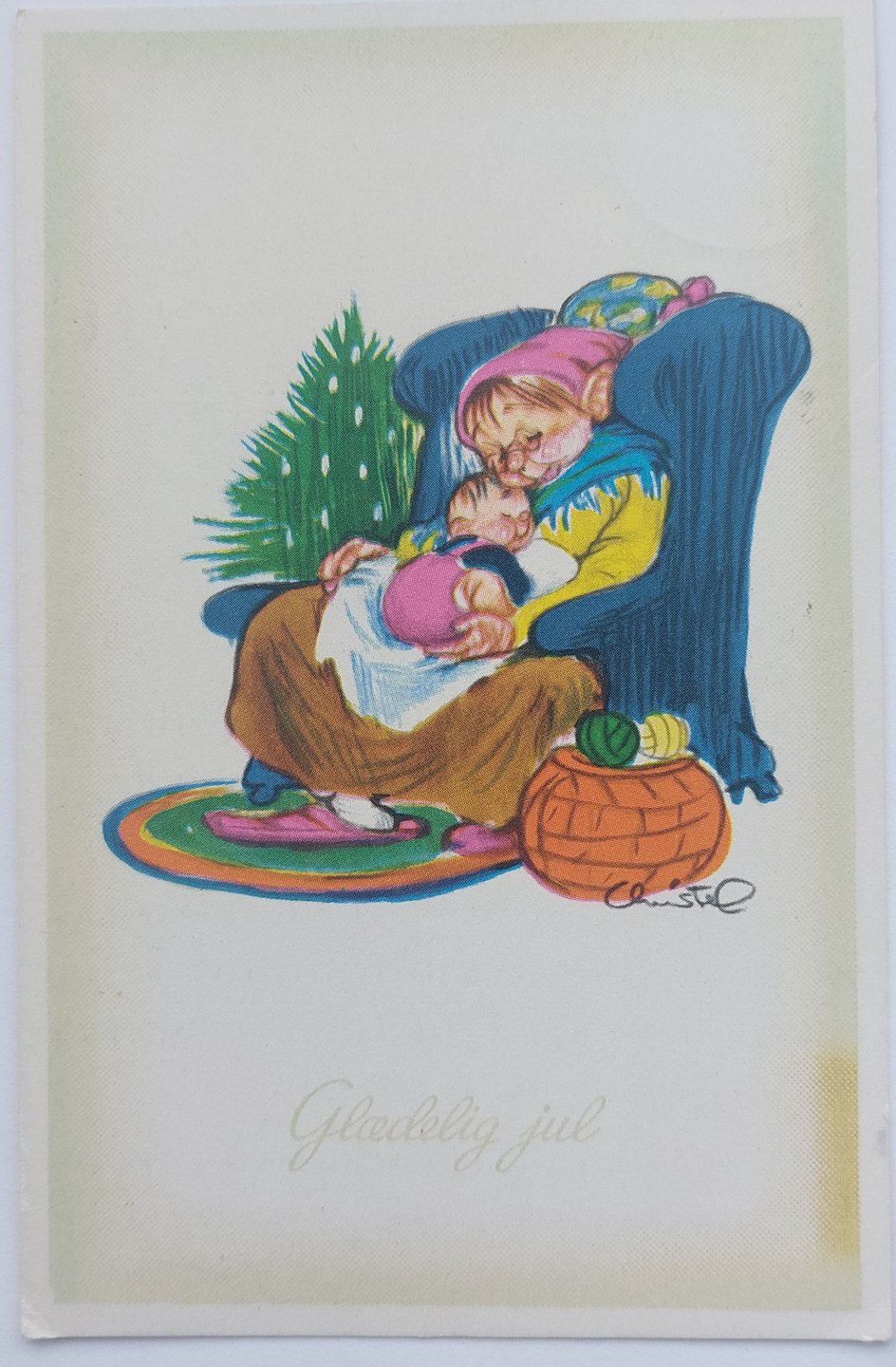 Tegnede julepostkort tegnet af Christel. Det ene ubrugt det andet brugt og sendt i julen 1970. I god stand