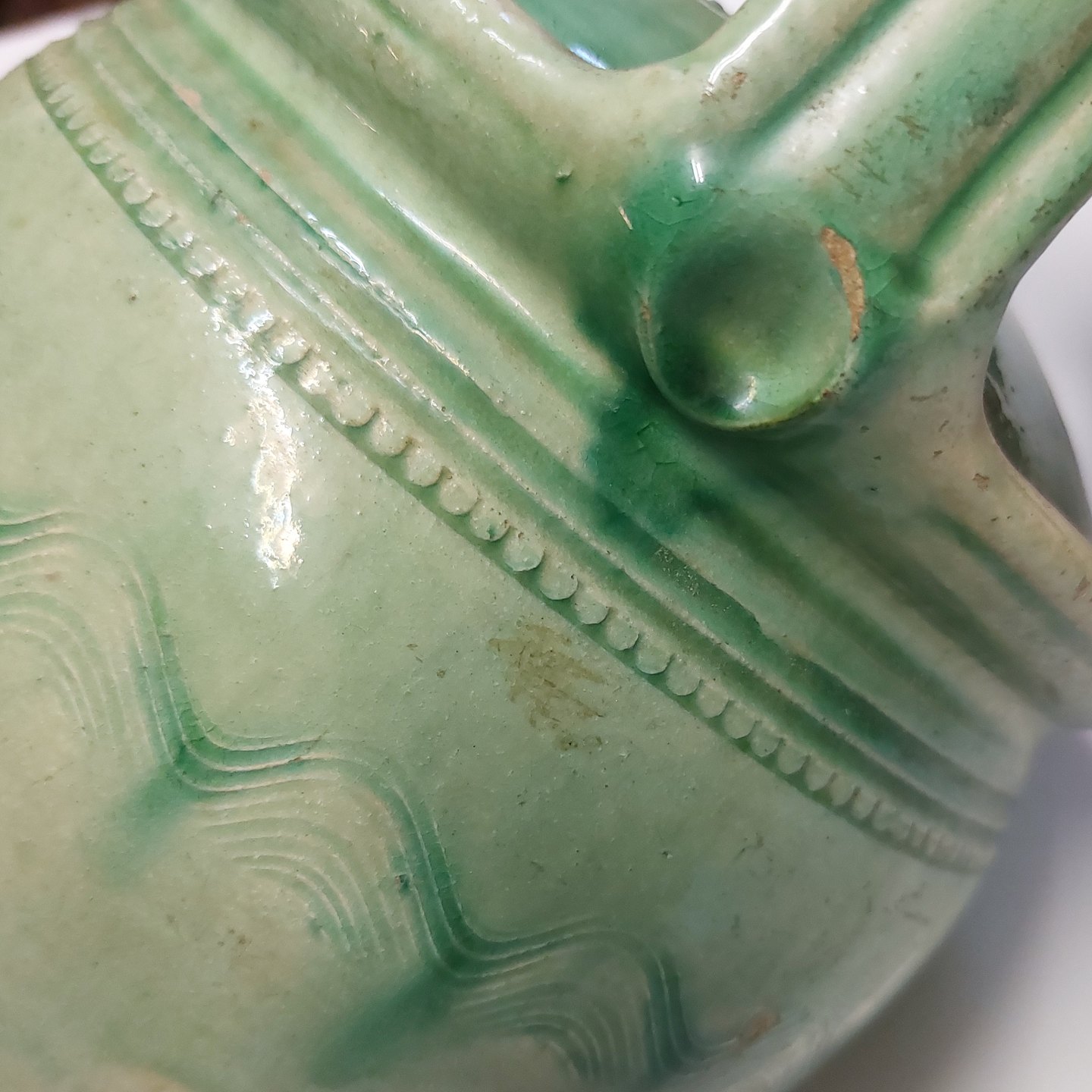 Barselspotte i keramik med hank og tilhørende låg. Grønt glaseret. I god stand med alm. brugsspor. I god stand. Uden skader eller reparationer. Indridset dekoration på underdelen. H. 26,5 cm incl. hanken