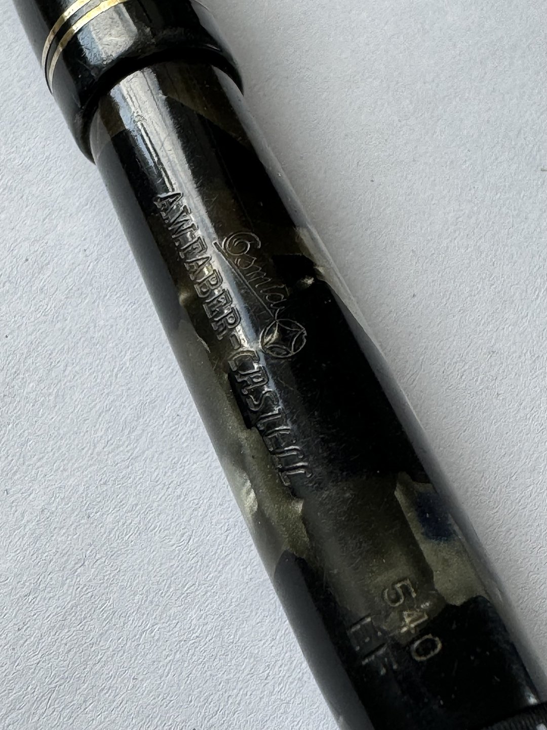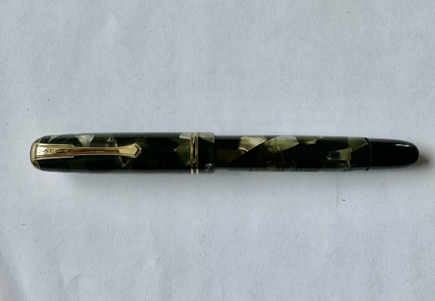 Grøn marmoreret Osmia A. W. Faber-Castell 540. Piston filler. Fremstår i flot stand. Ingen skader eller reparationer. Påfyldningsmekanismen skal dog laves før end fyldepennen igen kan optage blæk og skrive igen. Alle dele originale Osmia inklusiv en flot 14 karat guldspids. Mål: 12,5 cm