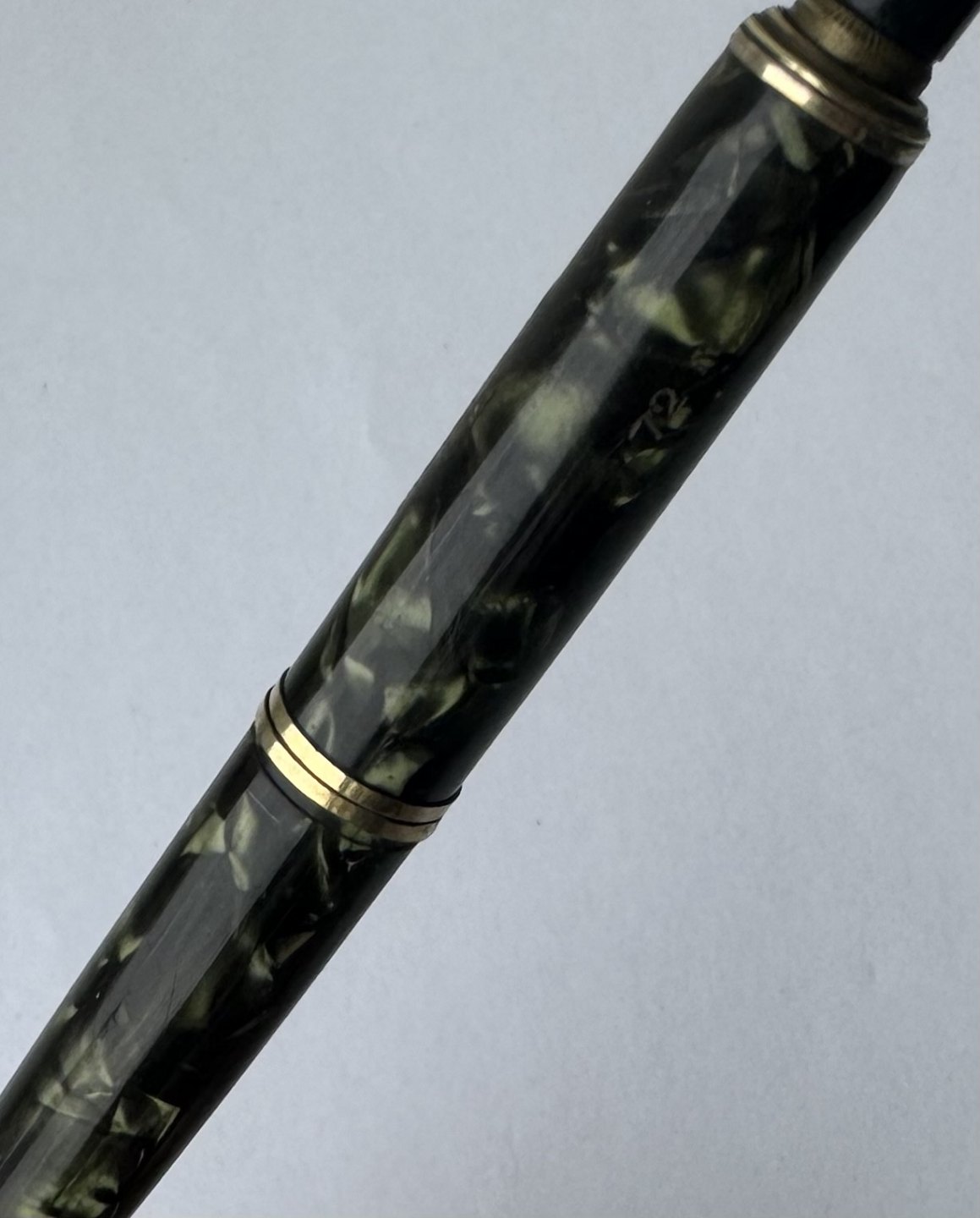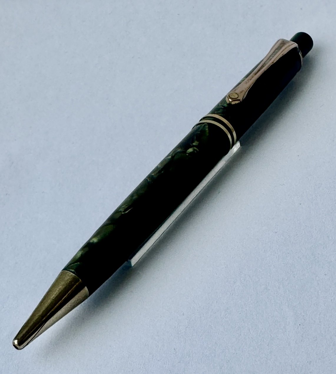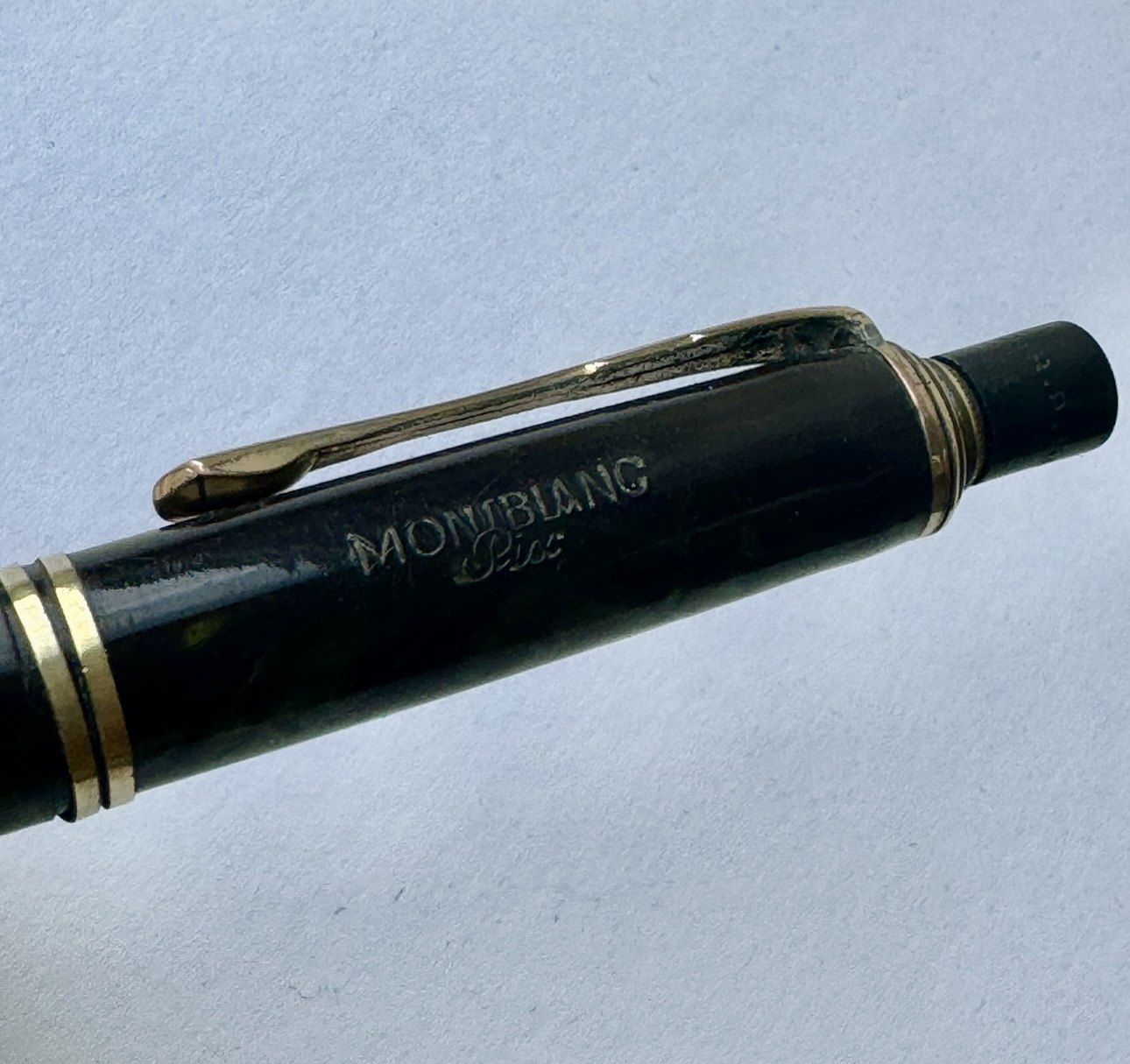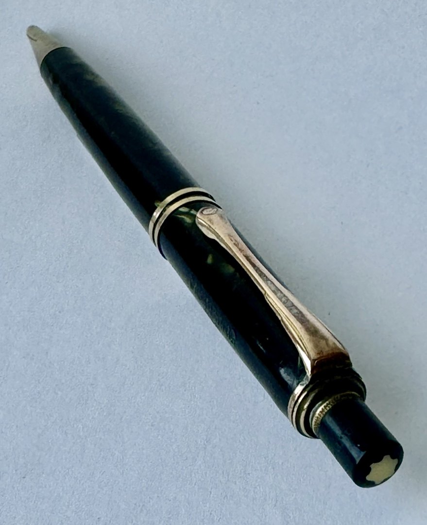 Grøn marmoreret Montblanc Pix 72n skrueblyant / stiftblyant / pencil fra slutningen af 1940’erne. Fremstår i god stand og klar til at blive brugt. Har et par løse “mavebælter”, der dog ikke ændrer på funktionalitet. Længde 12,8 cm
