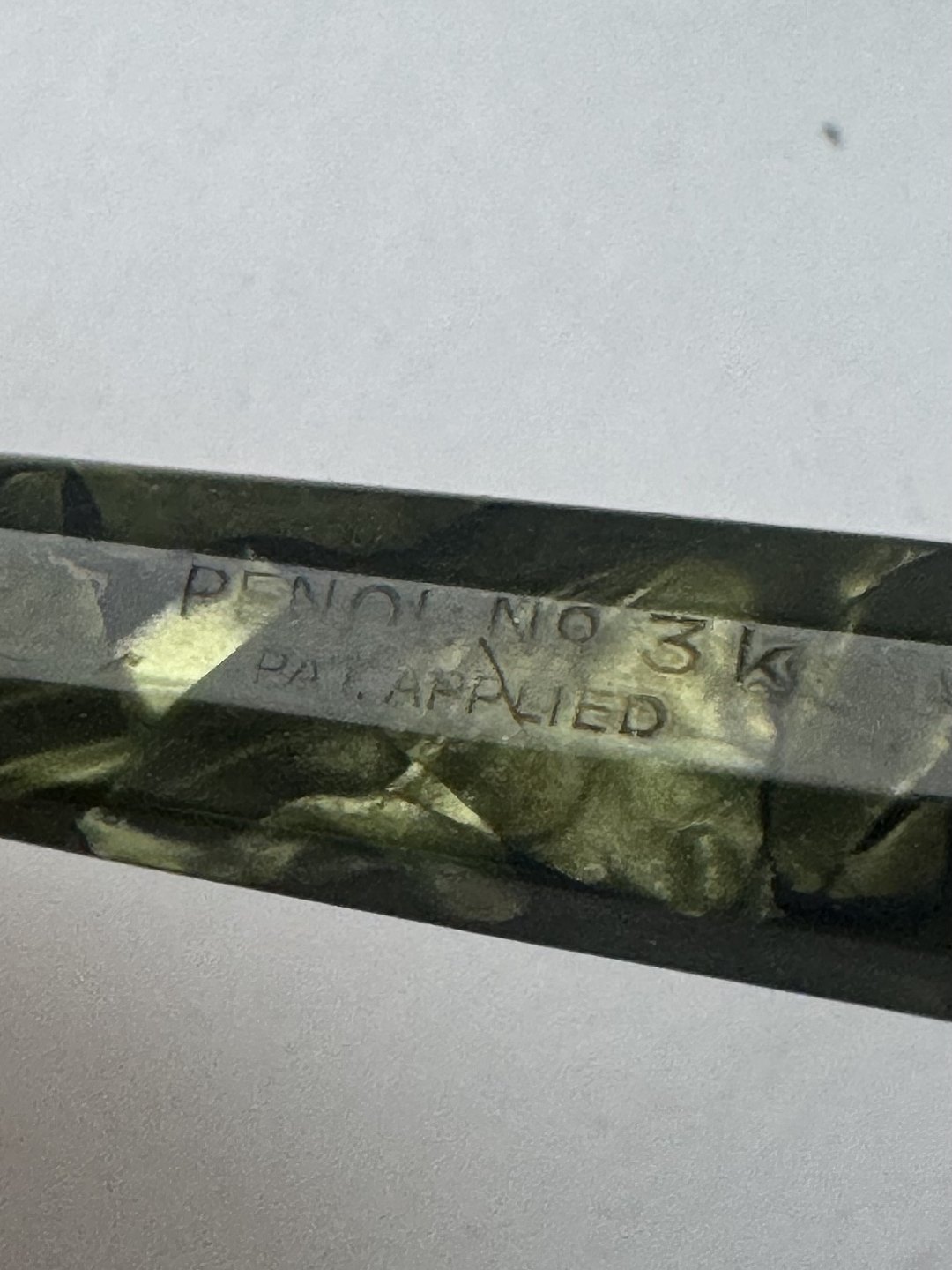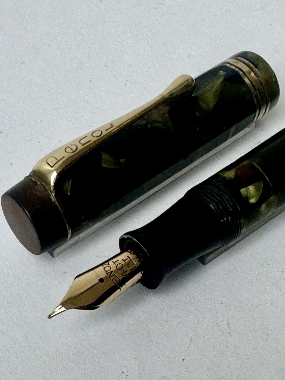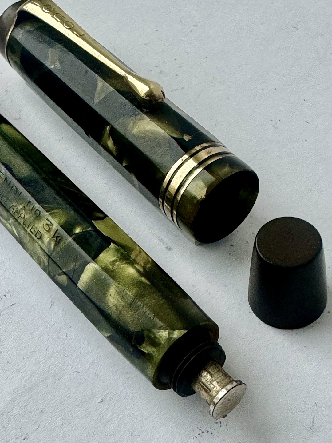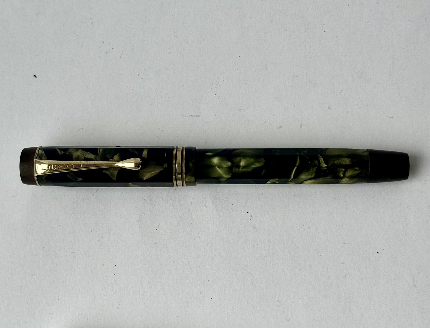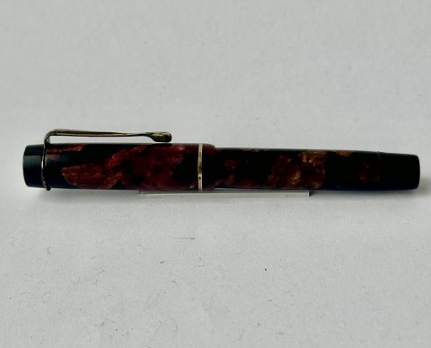10-kantet og grønt marmoreret Penol 3k fyldepen. Fremstår i god stand med alle originale Penol dele. Inklusiv en 14 karat guldspids. Der skal indsættes ny gummisæk, så pennen igen kan optage blæk og skrive igen. Længde: 13,3 cm.